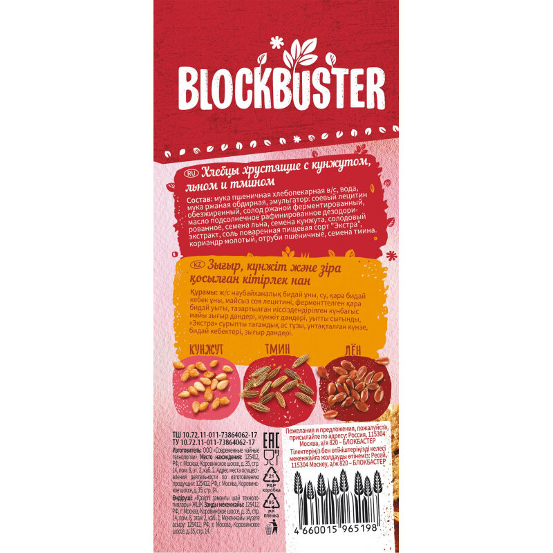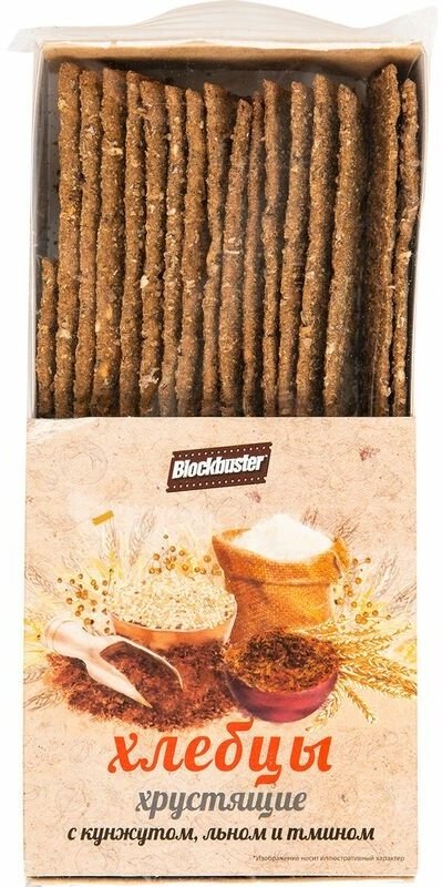 Хлебцы Blockbuster с кунжутом, льном и тмином. В приготовлении хлебцев используются старинные рецепты. Тесто готовится на натуральной закваске, используются разные сорта муки, в том числе и мука грубого помола, богатая клетчаткой и ржаные отруби. Ржаная мука помогает снизить холестерин, улучшает обмен веществ, работу сердца, выводит шлаки. В составе присутствуют только натуральные ингредиенты, без добавления консервантов и усилителей вкуса. Продукт подходит для здорового питания. Состав: мука пшеничная хлебопекарная в/с, вода, мука ржаная обдирная, эмульгатор соевый лецитин обезжиренный, солод ржаной ферментированный, рапсовое масло (рафинированное дезодорированное высшего сорта), семена льна, семена кунжута, солодовый экстракт, соль поваренная пищевая сорт Экстра, кориандр молотый, отруби пшеничные, семена тмина.