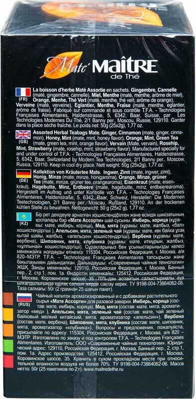 Чай Maitre Матэ ассорти 25 пакетиков — великолепный букет из пяти самых уютных и согревающих ароматов тонизирующего чая матэ, которые подарят невероятное тепло и умиротворение, а также будут стоять на страже здоровья в качестве вкусного профилактического или оздоравливающего напитка. В его состав входят следующие купажи: Имбирь, корица — идеальный напиток для поддержания сил и здоровья в периоды повышенной утомляемости и ослабленного иммунитета. Великолепное трио зарядит бодростью, вернет силы и поможет быстрее восстановиться или не поддаться вирусам и простуде; Мед, мята — не менее полезный напиток, способствующий повышению защитных сил. Он поможет расслабиться и настроит на крепкий сон, в то же время, освежая яркими нотками мяты; Апельсин, мята, зеленый чай — невероятно яркий, ароматный и сочный купаж, покоряющий своей оригинальностью и чудесным вкусом; Вербена — тонизирующий, но, в то же время, успокаивающий чай. Помогает бороться с простудой и является источником важных витаминов и микроэлементов; Шиповник, мята, клубника — вкусный, полезный, ароматный и нежный напиток, который дарит массу приятных мгновений и поддерживает здоровье организма. Великолепное ассорти Maitre Матэ займет достойное место в чайной коллекции тех, кто ценит силу природы, любит ее ароматы и с удовольствием наслаждается чистыми, первозданными вкусами. Для приготовления согревающего напитка воспользуйтесь чашкой или заварочным чайником, смочите пакетик матэ прохладной кипяченой водой и залейте кипятком. Настаивайте его 3-5 минут. По желанию можно добавить ложечку сахара, чтобы подчеркнуть сладкие нотки чая. Каждый чайный пакетик упакован в бумажный конверт, чтобы предотвратить смешивание ароматов и защитить от посторонних запахов. Попробуйте замечательный букет изысканного ассорти Maitre Матэ. Состав: мате, имбирь, корица; мате, мята, ароматизатор «мед»; мате, чай зеленый байховый мелкий китайский, мята, ароматизатор «апельсин»; мате, вербена; мате, шиповник, мята, ароматизатор «клубника». Способ приготовления: заварить чайный пакетик в чашке или заварочном чайнике кипяченой водой и настоять 3-5 минут. Вес: 50 г. Количество пакетиков в упаковке: 25 штук по 2 г. Тип упаковки: картонная коробка. Условия хранения: хранить в чистом, хорошо вентилируемом помещении без посторонних запахов при относительной влажности воздуха не более 70%. Страна производства: Россия. ТУ 9191-012-58261099-12.