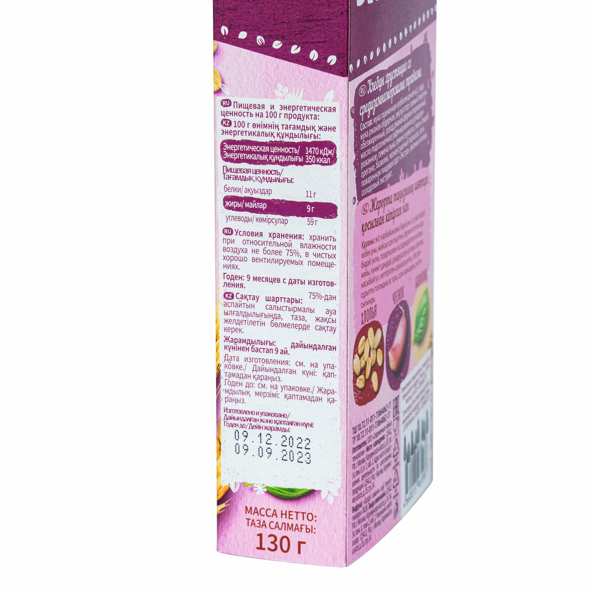 Хлебцы хрустящие Blockbuster со средиземноморскими травами приготовлены из смеси пшеничной и ржаной муки. В приготовлении не используются дрожжи. Добавленные специи трав орегано и базилика придают хлебцам пикантный вкус. Содержат клетчатку, которая улучшает пищеварение, очищает организм, восполняет запас энергии. Прекрасная альтернатива хлебобулочным изделиям. На праздничном столе можно использовать в качестве закуски в сочетании с авокадо, сыром, ветчиной, салатами. Очень сытный, питательный и полезный перекус. Подходит людям, придерживающимся вегетарианского типа питания. Состав: мука пшеничная хлебопекарная в/с, вода, мука ржаная обдирная, эмульгатор: соевый лецитин обезжиренный, солод ржаной ферментированный, масло подсолнечное рафинированное дезодорированное, семена льна, семена кунжута, смесь специй: орегано, базилик, чеснок сушеный порошок, соль поваренная пищевая сорт «Экстра», овсяные хлопья, солодовый экстракт. Пищевая ценность на 100 г продукта: белки — 11 г, жиры — 9 г, углеводы — 59 г. Энергетическая ценность: 350 ккал. Условия хранения: хранить при относительной влажности воздуха не более 75% в чистых хорошо вентилируемых помещениях, при температуре от 15 до 25°С. Вес: 130 г. Срок годности: 270 суток.