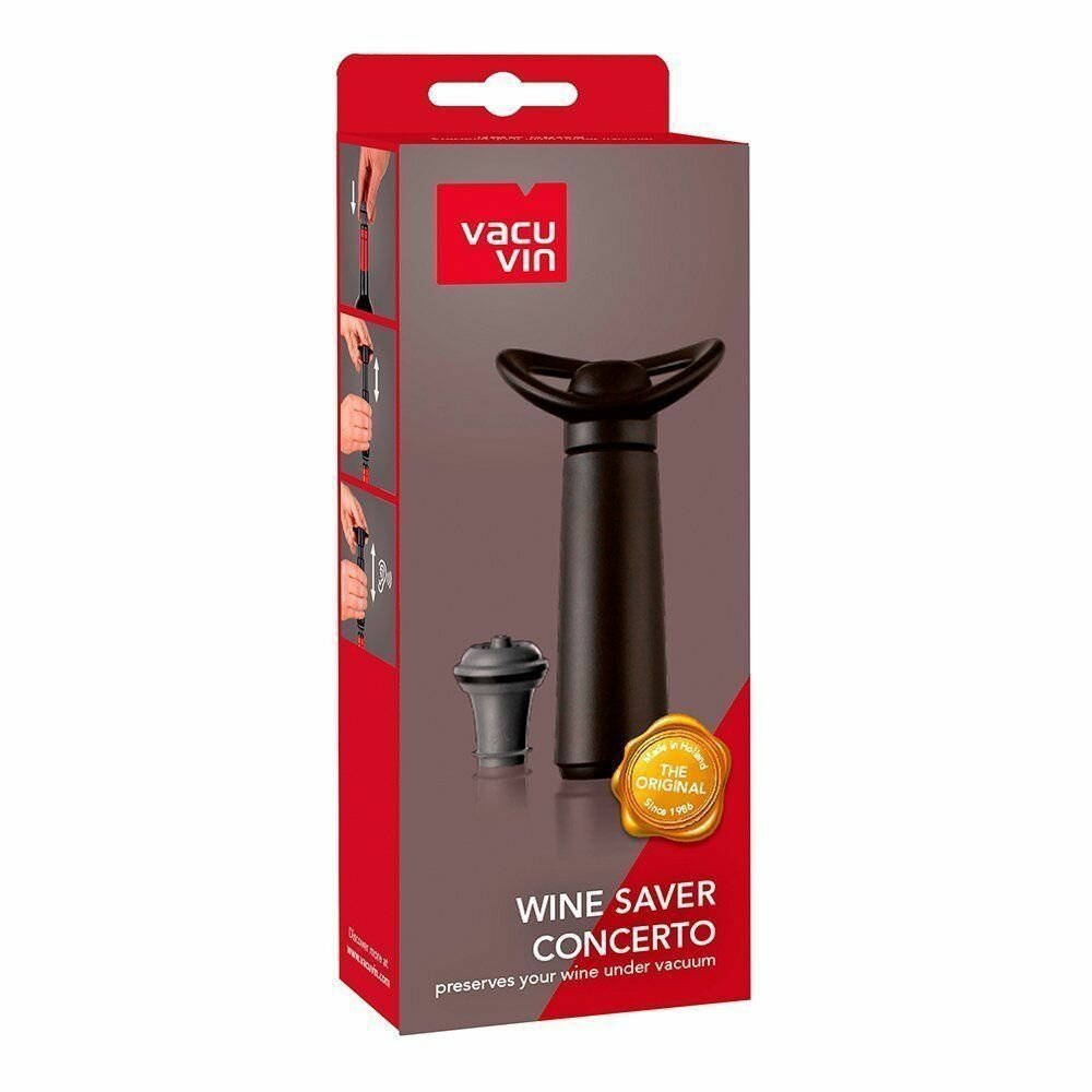 Vacu Vin Вакуумный насос с винной пробкойВакуумный насос Концерто от Vacu Vin откачивает воздух из открытой бутылки и снова запечатывает ее многоразовой резиновой пробкой. Поместите пробку в горлышко бутылки и откачайте воздух с помощью вакуумного насоса. Когда вы достигнете оптимального уровня вакуума, раздастся щелчок. Вакуум замедляет окислительный процесс, благодаря чему вы можете насладиться первозданным вкусом вина даже спустя несколько дней.Vacu Vin – компания, основанная в 1986 году, занимающаяся инновационными разработками в области употребления и хранения вина и имеющая мировые патенты. А это значит, что ни одно другое предприятие не может выпускать аналоги товаров, разработанных фирмой. Так, компания разработала пробку для бутылок, создающую вакуум, что увеличивает срок хранения открытого вина. Качество и вкус напитка остаются неизменными в течение долгого времени. В ассортименте компании множество различных аксессуаров: рубашки для охлаждения вина, сумки для бутылок, вакуумные насосы и многое другое – одним словом все, чтобы сделать употребление вина максимально " правильным". У компании множество мировых наград в области революционных технологий. Для производства Vacu Vin использует материалы только премиального качества. Изделия этого бреда оценили люди уже из 80 стран мира, одной из которых, к счастью, является Россия.