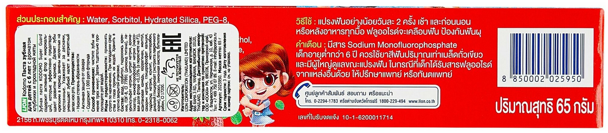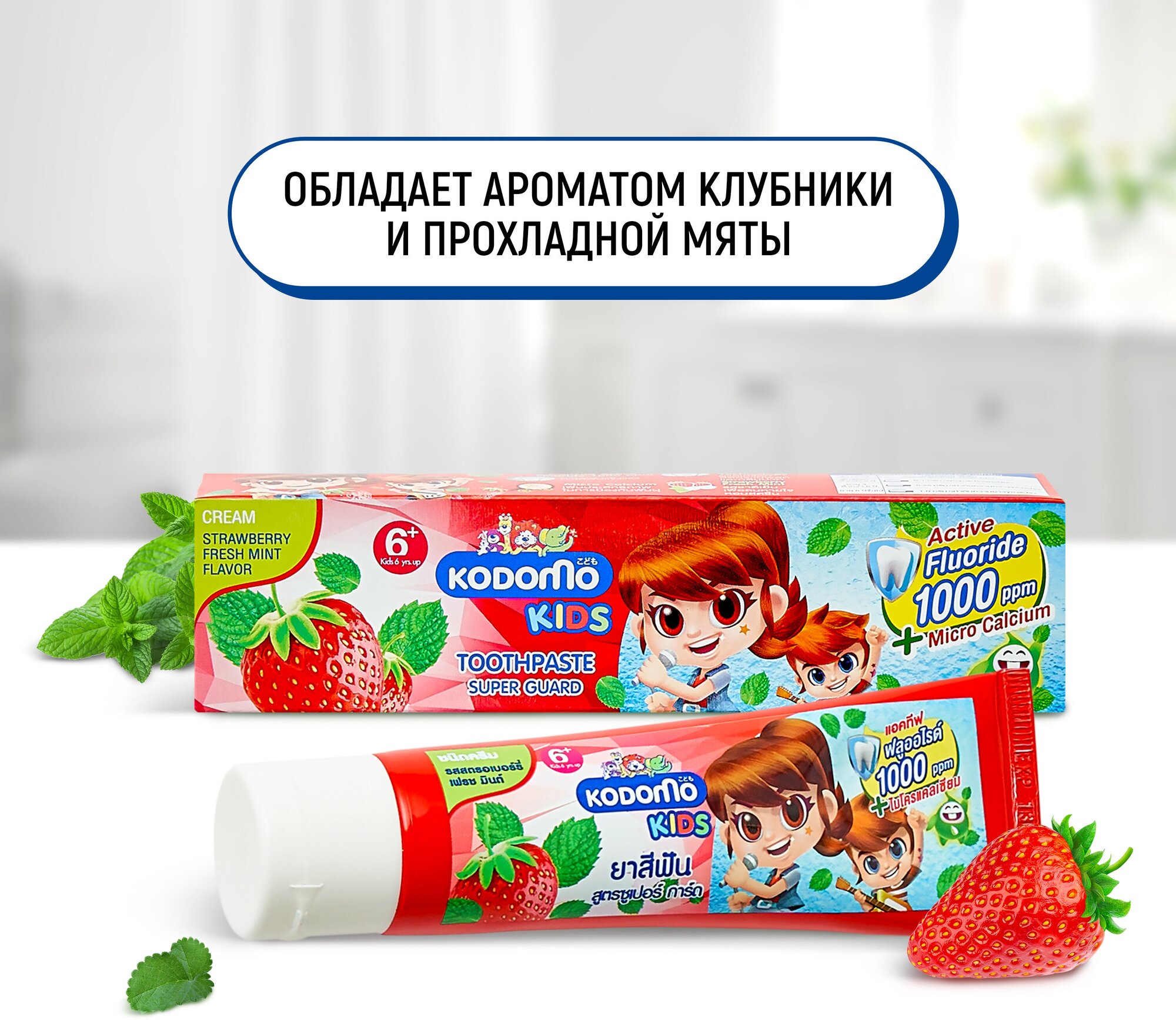 Зубная паста KODOMO Super Guard с ароматом клубники и прохладной мяты. Содержит активный фтор и микрокальций, которые эффективно предотвращают развитие кариеса. Делает зубы крепкими в период замены молочных на постоянные.
