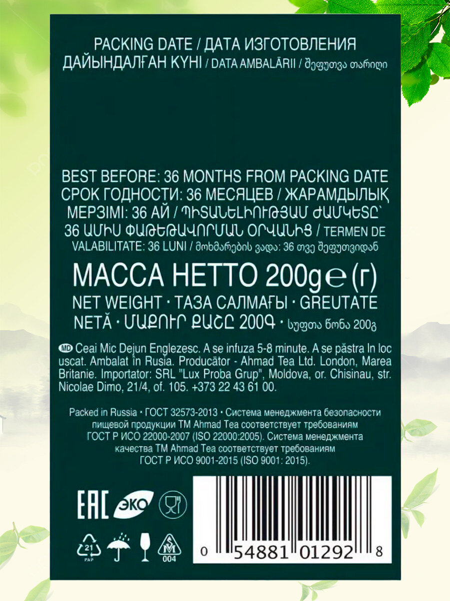 Чай Ahmad English No1 черный байховый 100 пакетиков — это эксклюзивное сочетание высококачественных черных чаев из Кении, Шри-Ланки и Ассама, которое дарит гарантированное удовольствие всем поклонникам чая. Утонченный вкус с легкими нотками бергамота, глубокий янтарный цвет и мягкий аромат способны создать душевную атмосферу, улучшить настроение и зарядить бодростью. Ahmad English No1 станет прекрасным вариантом для ежедневных чаепитий как дома, так и в офисе. Это классика, к которой всегда хочется вернуться, от которой сложно отказаться. Для приготовления чашки бодрящего напитка вскипятите воду и залейте необходимое количество чайных пакетиков, по одному на чашку. Дайте настояться 3-5 минут, добавьте по желанию сахар или лимон. Чашка свежезаваренного Ahmad English No1 идеально дополнит десерт, отлично подойдет к легким закускам и прекрасно утолит жажду без дополнительных блюд. В упаковке 100 пакетиков чая, рассчитанных на соответствующее количество чашек, что удобно для использования в больших коллективах и для частых семейных чаепитий. Состав: чай черный байховый. Способ приготовления: заварить чайный пакетик в чашке или заварочном чайнике кипятком и настоять 3-5 минут. Вес: 200 г. Количество пакетиков в упаковке: 100 штук по 2 г. Тип упаковки: картонная коробка. Условия хранения: хранить в чистом, хорошо вентилируемом помещении без посторонних запахов при относительной влажности воздуха не более 70%. Страна производства: Россия. ТУ 9191-001-59050909.