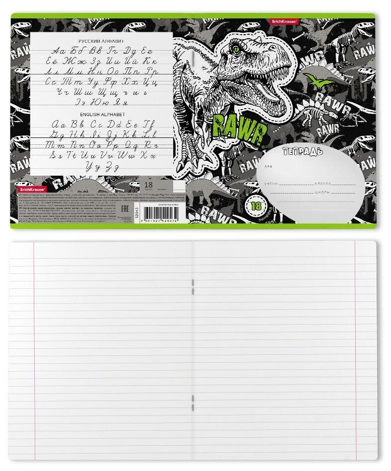 ErichKrause Тетрадь школьная ученическая Dinosaur Park линейка 18 листов Тетрадь школьная ученическая формата А5+ (170х203 мм). Обложка из высококачественного мелованного картона плотностью 180 г/м2. -В блоке 18 листов в линейку с полями. -Бумага офсетная плотностью 60 г/м2. -Цвет линовки - синий. -Скругленные уголки обложки и блока. -Тип скрепления - скоба. Тетради упакованы в термоусадочную пленку по 10 штук.