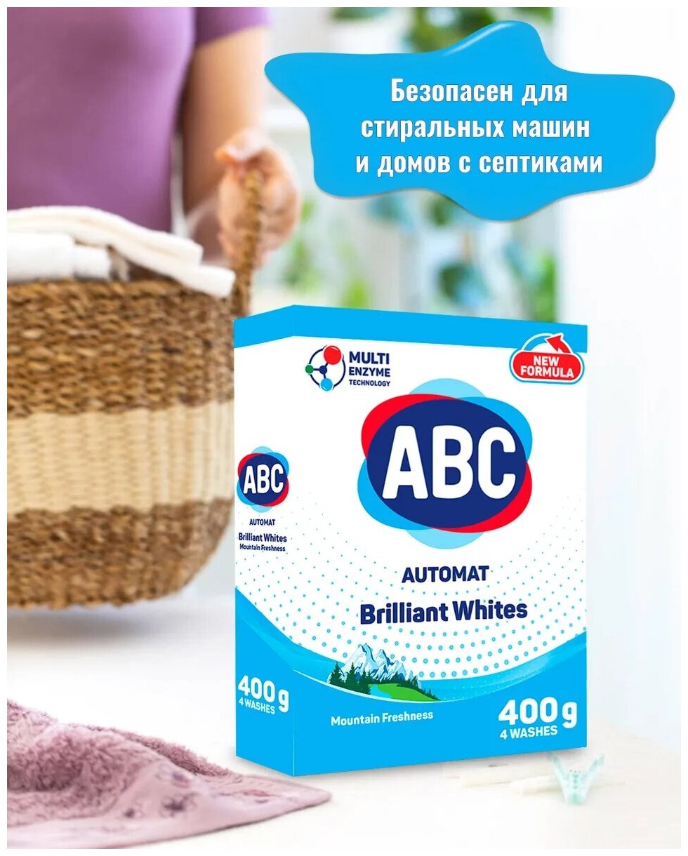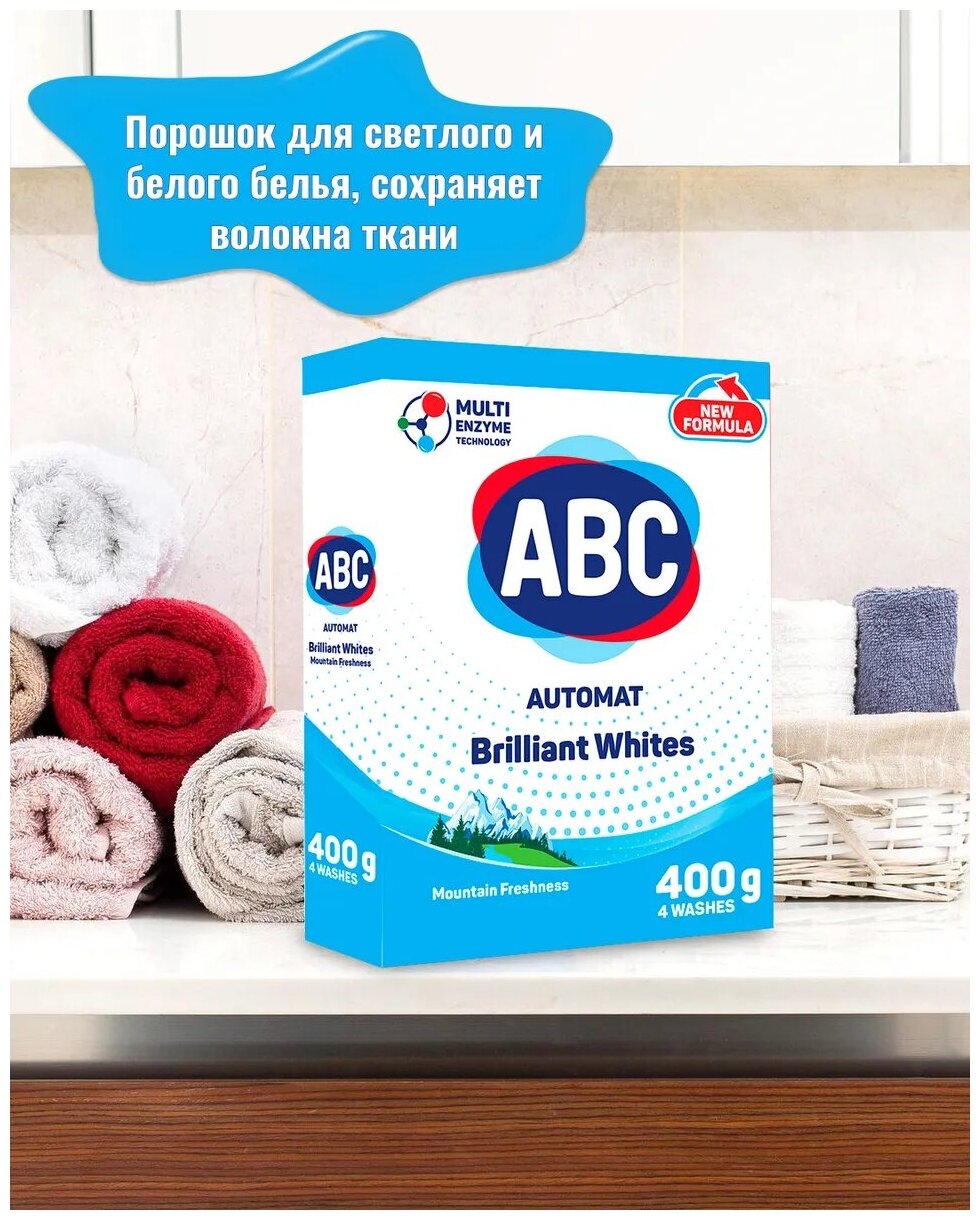 Порошок для стирки белья ABC Свежесть гор. Порошок для автоматической стирки белого белья удаляет стойкие пятна, в комплексе с активными компонентами усиленного действия глубоко проникают в волокна ткани и эффективно справляются со всеми видами загрязнений. Благодаря системе контроля пенообразования, средство эффективно выполаскивается и не остается в волокнах ткани после стирки. Натуральные ферменты и компоненты удаляют 99,9% микробов, а также все виды бытовых клещей и продукты их жизнедеятельности из волокон ткани. Удаляет неприятные запахи. С отбеливающим эффектом. Природные отбеливающие компоненты и ферменты эффективно удаляют пятна белкового происхождения. Типы тканей: хлопок, лен, полиэстер, вискоза, нейлон, акриловое волокно.