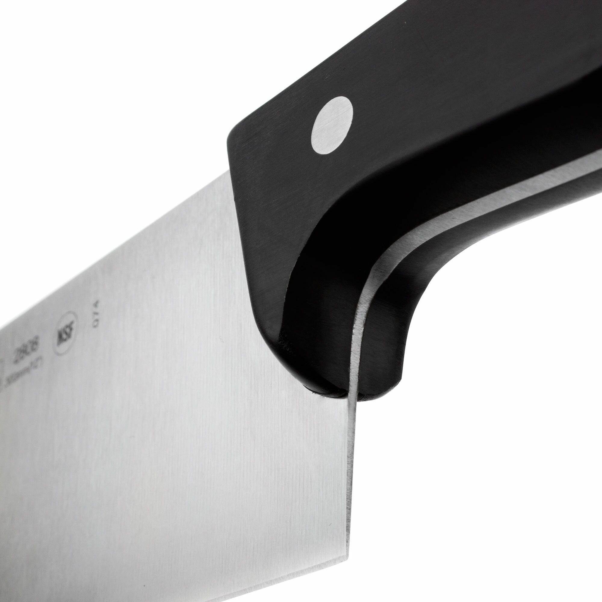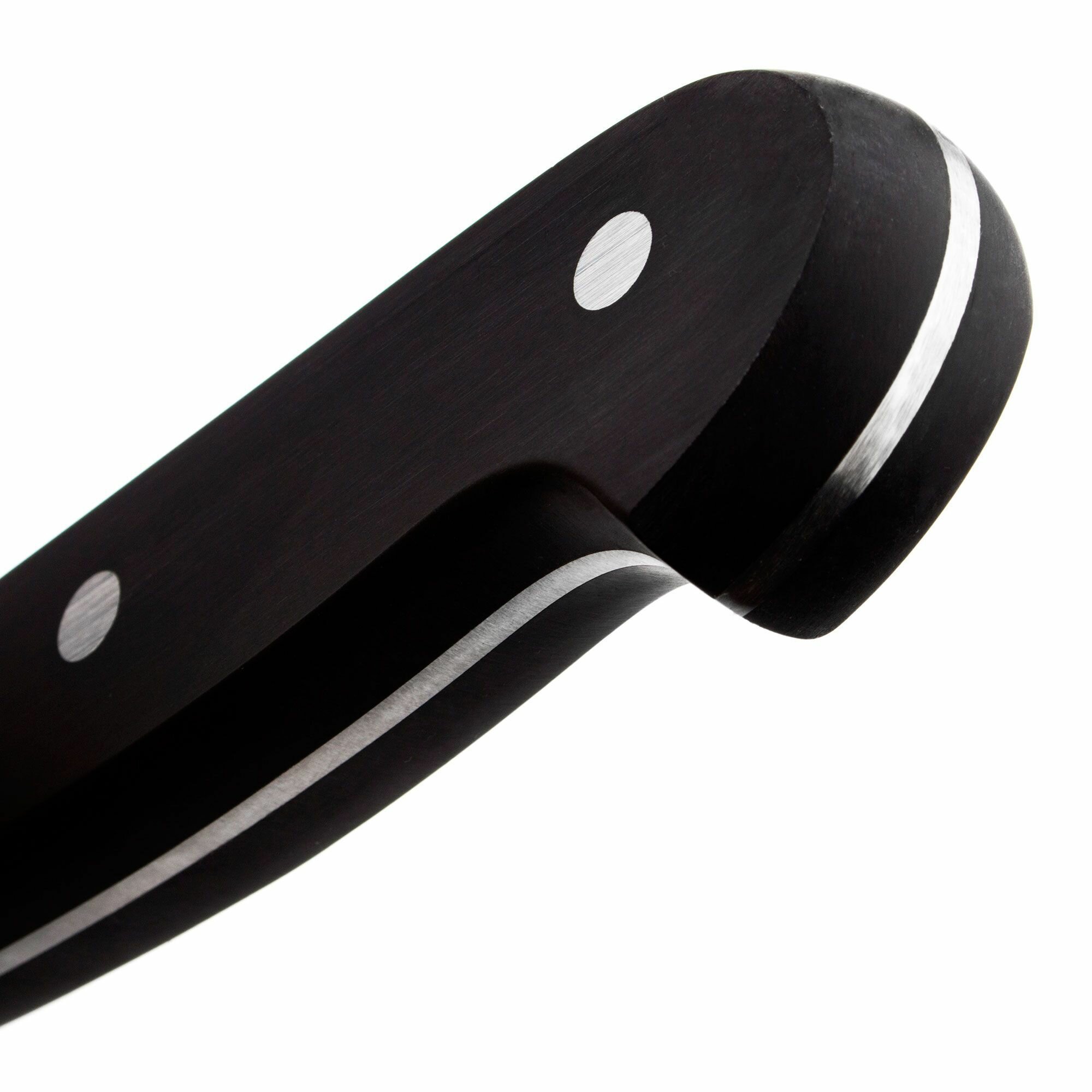 Рукоять из пластика удобно держать в руке. Она не скользит и не нагревается при длительной работе. Нож легко очистить от загрязнений под проточной водой или в посудомоечной машине.