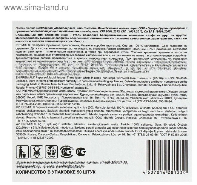 Салфетки косметические Premial 3-слойн в коробке нон стоп 50 шт.