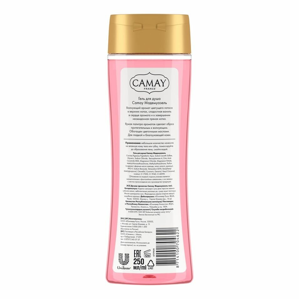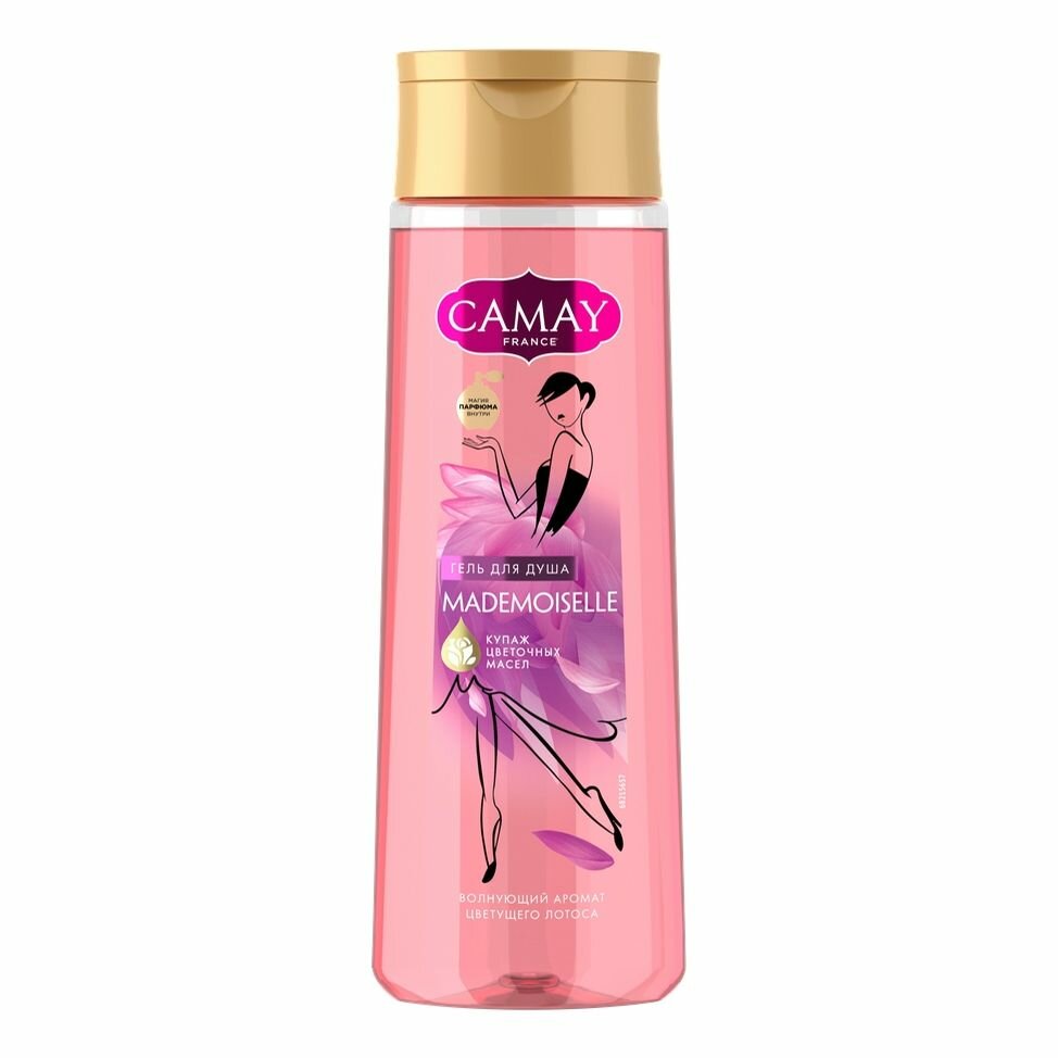 Гель для душа Camay Мадмуазель с игривым сладким ароматом лотоса, бережно очищает кожу, обеспечивая незабываемое ощущение свежести на весь день. Благодаря насыщенной кремовой текстуре средство с легкостью превращается в нежную пену, смывается водой, позволяя коже дышать, делает ее нежной и благоухающей. А формула помогает сохранить естественную увлажненность кожи и предотвращает возникновение чувства сухости и стянутости после использования. А соблазнительный аромат поднимает настроение, придаёт сил и обаяния.