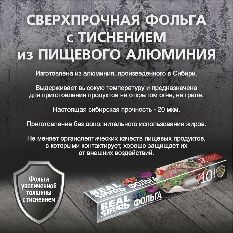Пищевая алюминиевая фольга REAL SIBIRЬ Гриль толщиной 20 мкм обладает повышенной термостойкостью, Предназначена для приготовления пищи в собственном соку на открытом огне, на гриле. Особо прочная фольга для запекания, выпечки и хранения продуктов Real Sibirь изготовлена из алюминия, произведенного в Сибири. Выдерживает высокую температуру и предназначена для приготовления продуктов на открытом огне, на гриле. Настоящая сибирская прочность - 20 мкм. Специальная ячеистая структура повышает прочность фольги и позволяет ей сохранять придаваемую форму. Фольга Real Sibirь позволяет готовить без дополнительного использования жиров. Не меняет органолептических качеств пищевых продуктов, с которыми контактирует, хорошо защищает их от внешних воздействий. Повышенная прочность, надежность – вот главные качества товаров из Настоящей Сибири. Это честные продукты, созданные с сибирской практичностью и любовью. От чистого сибирского сердца.