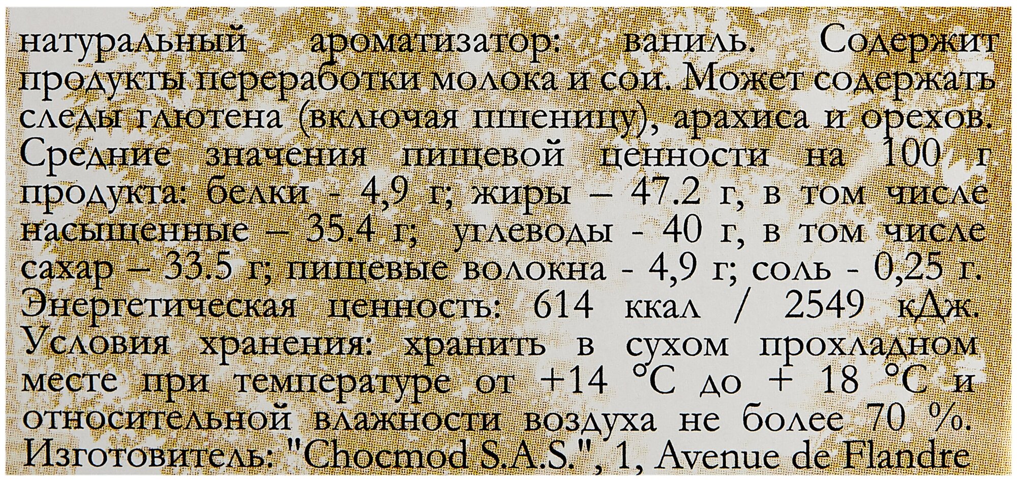 | Состав | Негидрогенизированные растительные жиры (пальмовый, пальмоядровый), сахар, какао с пониженным содержанием жира, сухая молочная сыворотка, какао порошок, эмульгатор: соевый лецитин; натуральный ароматизатор: ваниль |
