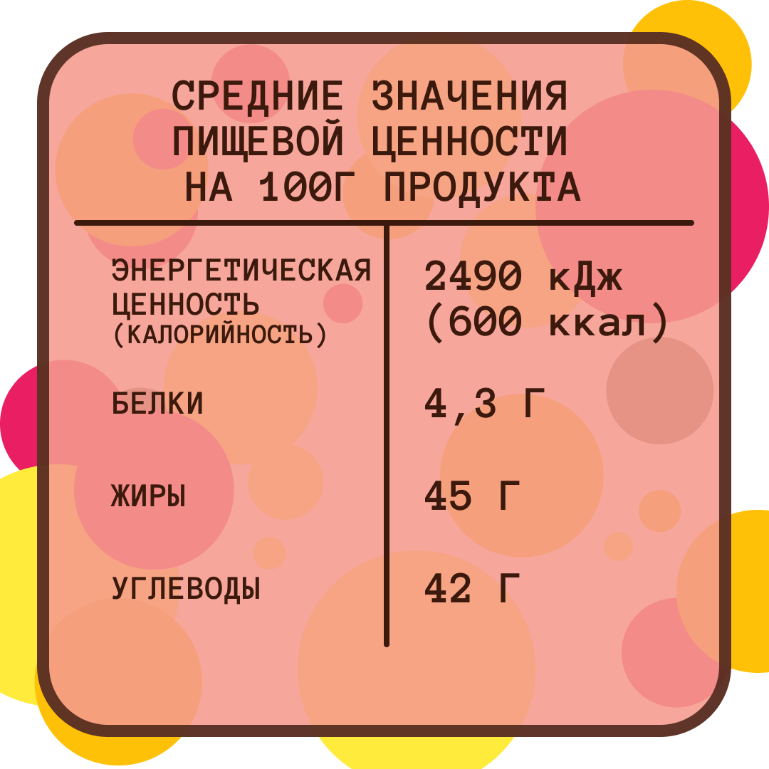 | Энергетическая ценность (ккал на 100 г) | 614 |