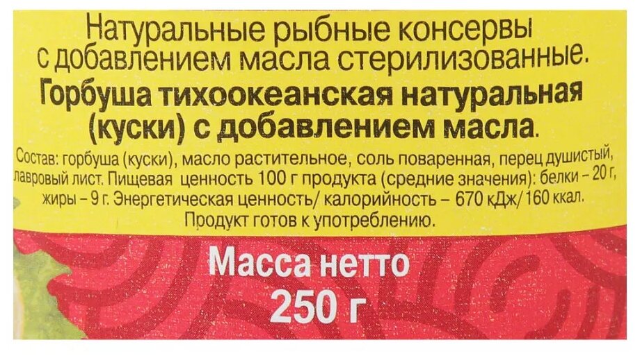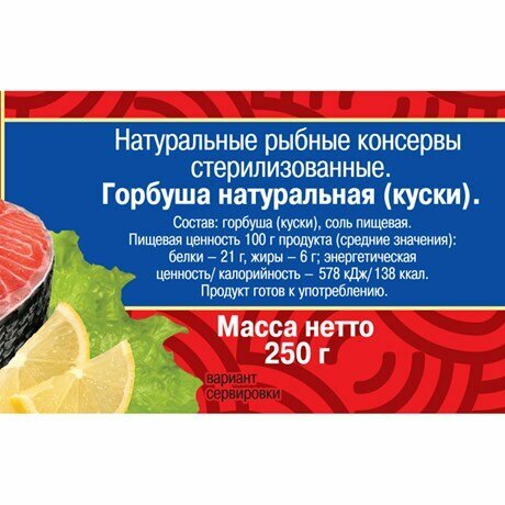| Состав | Горбуша(куски), масло растительное, соль поваренная, перец душистый, лавровый лист |