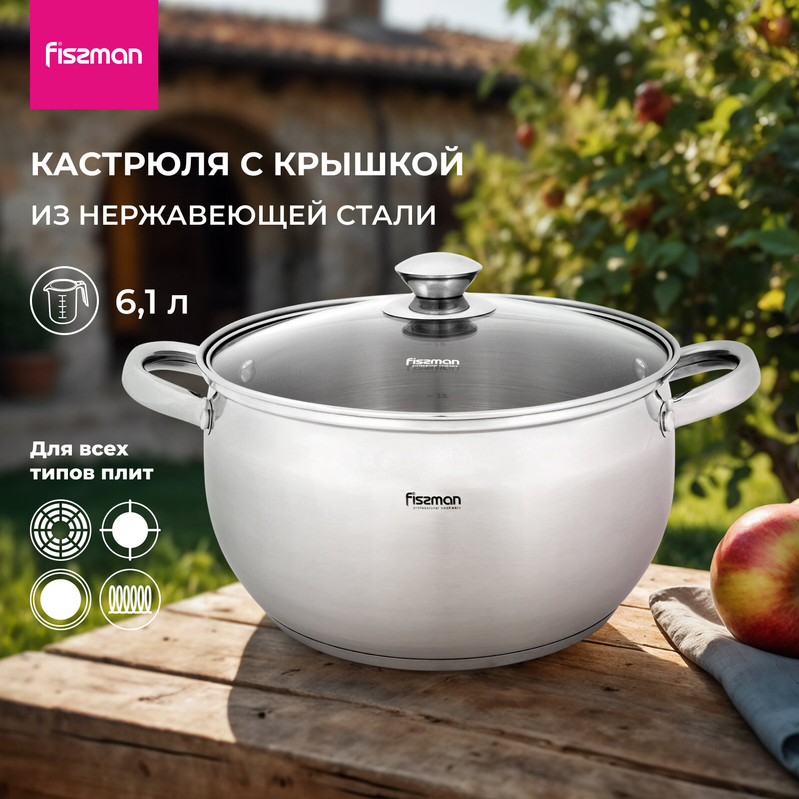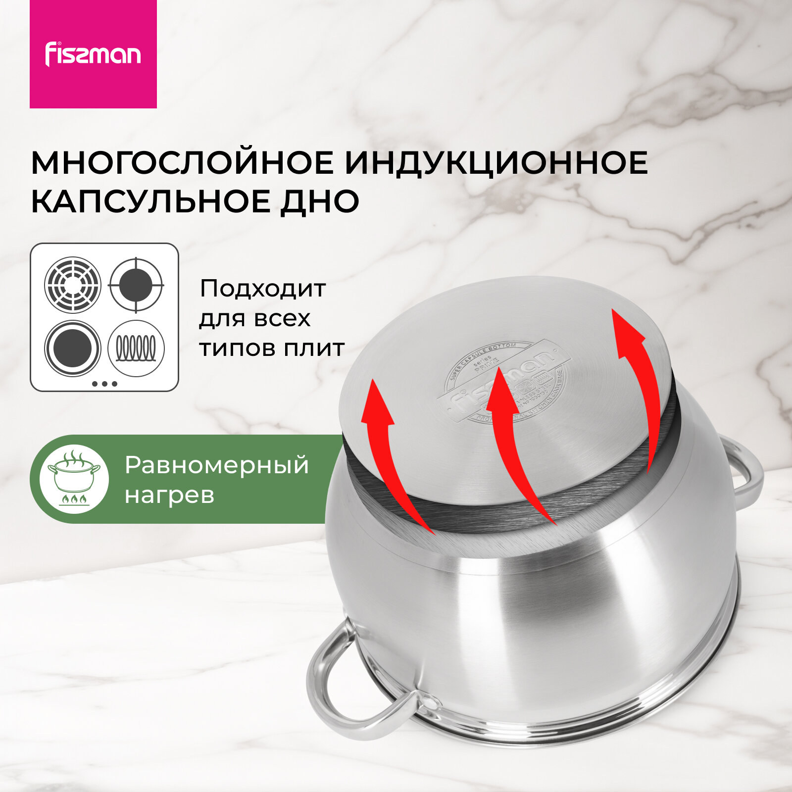 Компания FISSMAN ценит своих покупателей и относится к качеству своей продукции с особым вниманием. Посуда серии PRIME сделана из самой безопасной высококачественной нержавеющей стали марки 18/10 (INOX304), обладает жаростойкостью и коррозийной прочностью, очень легка в уходе. Многослойное капсульное дно обеспечивает равномерный нагрев и распределение тепла благодаря алюминиевой прослойке, раскрывая вкусовые качества блюда и сохраняя все полезные свойства продуктов, а индукционный слой делает посуду универсальной для всех типов плит. • Стальной корпус 18/10 (INOX304) (высококачественная нержавеющая сталь) • Многослойное индукционное дно (для всех типов плит, высокая теплопроводность) • Мерная шкала (для контроля количества жидкости) • Прозрачная ударопрочная стеклянная крышка с паровыпуском позволяет наблюдать за готовностью пищи, не открывая посуду, тем самым, исключая попадания брызг на кожу и одежду • Прочные и удобные для захвата стальные ручки на заклепках • Изогнутая форма - увеличение объема с сохранением небольшого диаметра и удобной высоты • Безопасно для здоровья и окружающей средыВыбирая фирменную стальную посуду PRIME FISSMAN, Вы можете быть уверены в лучшем стандарте качества и удобстве использования, а стильный оригинальный дизайн расставит акценты и станет украшением на любой кухне.
