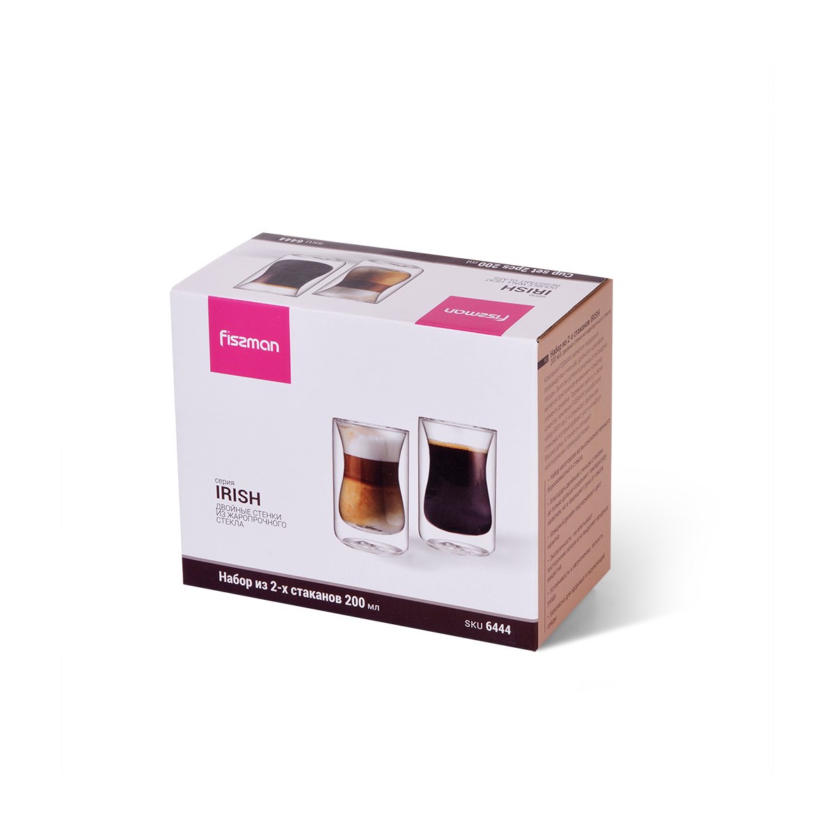 Компания FISSMAN является лидером в производстве стильной, удобной и красивой посуды. Залогом успеха в решении этой задачи является пристальное внимание к каждому элементу дизайна. Проявляя заботу о своих клиентах, компания FISSMAN разработала набор IRISH из 2- х стаканов с двойными стенками, который добавит уют и комфорт Вашему дому. А также он обладает неоспоримыми преимуществами: • Набор изготовлен из высококачественного боросиликатного стекла • Благодаря двойным стенкам стаканы не только дольше сохраняют температуру напитков, но и защищают руки от ожога • Изящный дизайн подчеркивает цвет напитка • Экологичность - не впитывает посторонние запахи и не выделяет вредные вещества • Устойчивость к загрязнению, легкость ухода • Безопасно для здоровья и окружающей средыВысочайшее качество и надежность, проверенные временем, являются отличительными чертами продукции FISSMAN!