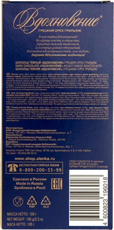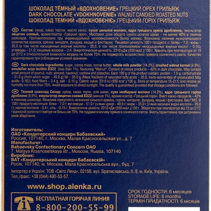 | Состав | какао тертое, сахар, масло какао, сухое цельное молоко, грецкий орех дробленый в сахаре, эмульгатор лецитин соевый, ароматизатор "Грецкий орех". Массовая доля общего сухого остатка какао - не менее 40% в темном шоколаде. Противопоказано при индивидуальной непереносимость белка молока. Возможно наличие незначительного количества арахиса, орехов |