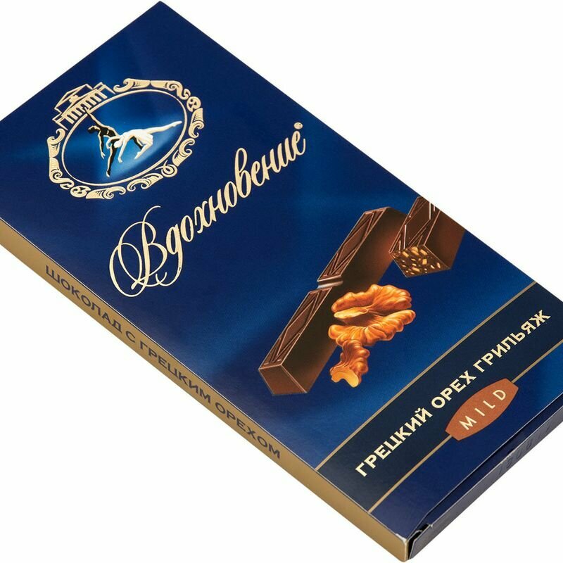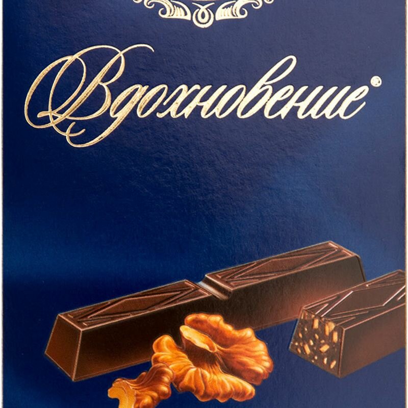 Темный шоколад "Вдохновение" с грецким орехом новое вкусовое воплощение любимого "Вдохновения". Традиционный темный шоколад с пряной горчинкой во вкусе дополнен дробленым ядром грецкого ореха. Он придает еще больше пикантности и пряности шоколадным "палочкам" в традиционных серебристых обертках.