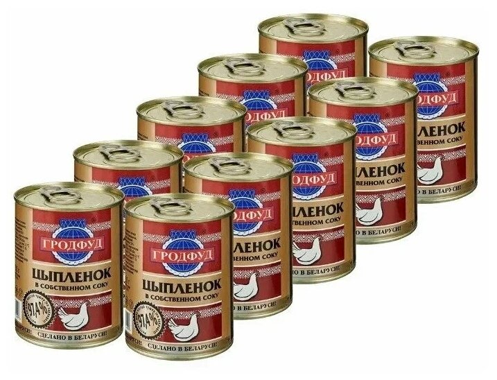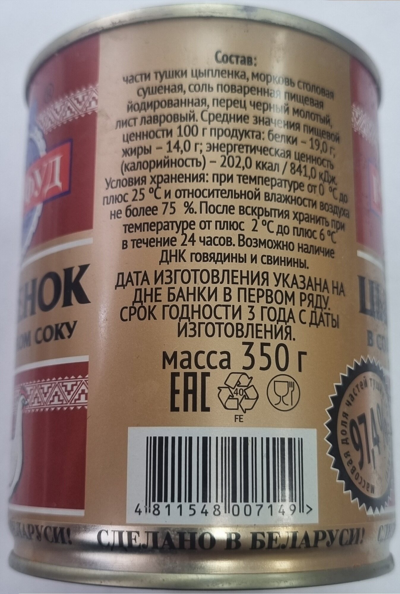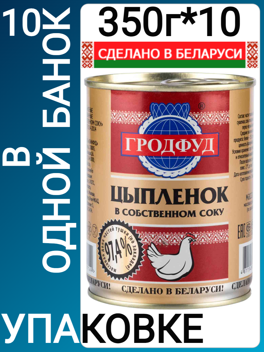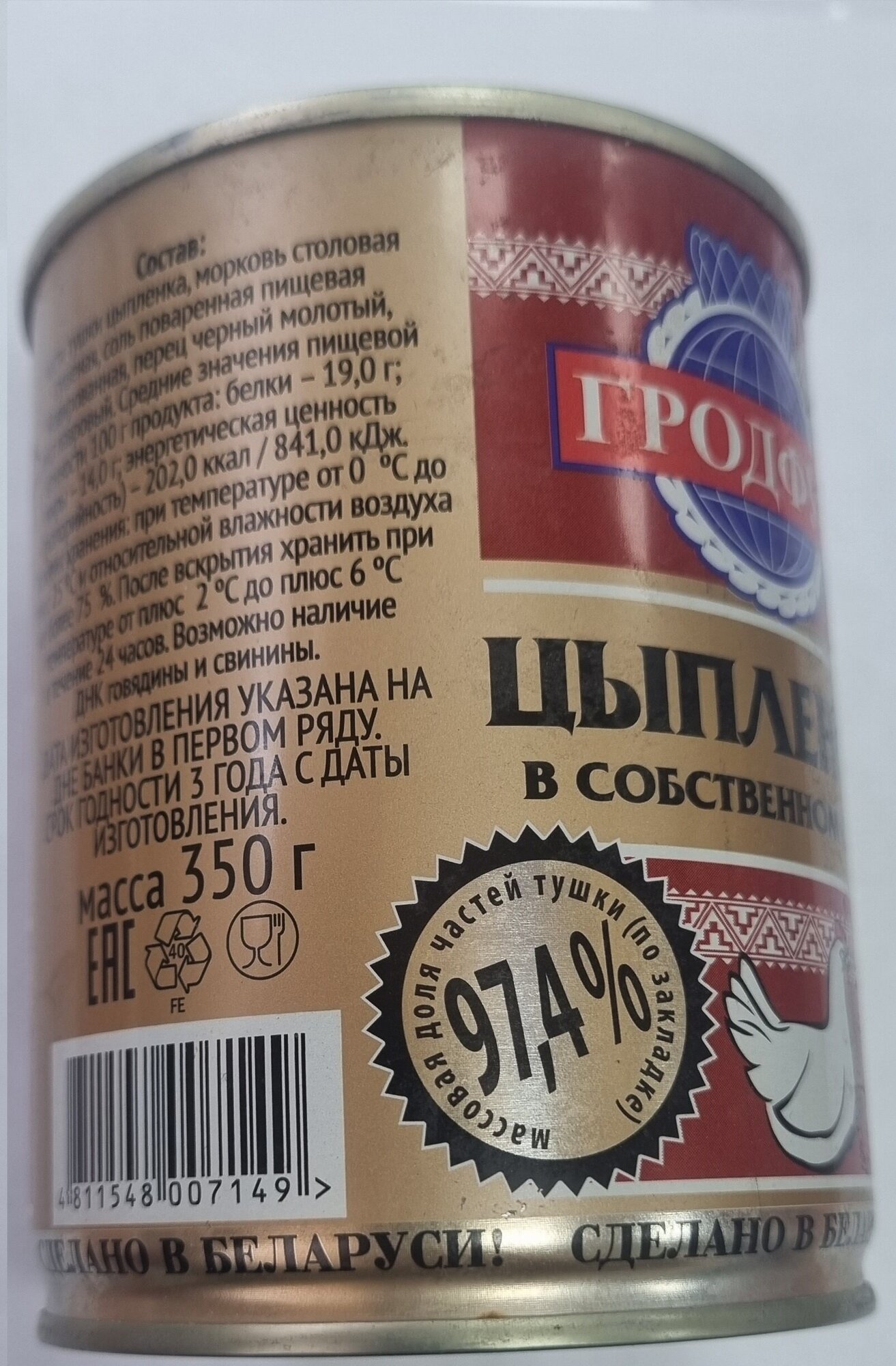 Мясные консервы Тушенка Гродфуд мясо цыпленка в с/с ж/б,350грТушенка Гродфуд из мяса цыпленка 350 г - это 'тушенка', которая полюбилась многим за счет значительного содержания мяса (97,4%) и пониженного содержания жира. Уникальность консервов из мяса цыпленка под ТМ Гродфуд состоит в том, что в их состав входят исключительно куриные бедра. Тушенка быстро утоляет голод, улучшает состояние кожи, волос, костей и восстанавливает энергетические потребности организма. Такое питание становится незаменимым продуктом в ежедневном рационе, а также выручает в походах и на даче. Продукт готов к употреблению, рекомендуется разогреть. Благодаря удобному кольцу банка легко открывается без применения консервного ножа. Состав: части тушки цыпленка, морковь столовая сушеная, соль поваренная пищевая йодированная, перец черный молотый, лист лавровый. Тип упаковки: жестяная банка Пищевая ценность на 100 г: Белки - 16 г, Жиры - 12 г. Энергетическая ценность на 100 г: 172 ккал. Условия или срок хранения: 24 месяца от даты производства. Хранить при температуре от 0°С до +20°С. После вскрытия хранить при температуре от +2°C до +6°С в течение 24 часов. ГОСТ 28589-90 Страна производства: Беларусь