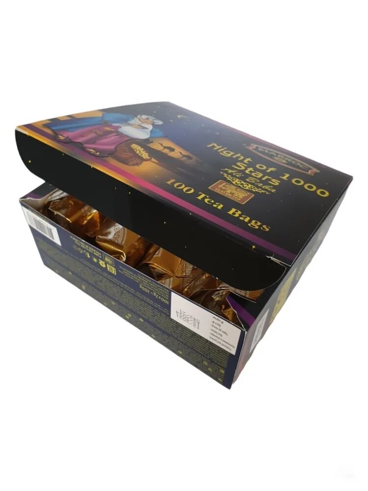 Чай Ночь 1000 звезд в пакетиках 100 шт. Производитель: Mabroc Teas. Чай произведен и упакован в Шри-Ланке. Состав: смесь цейлонского листового черного и зеленого чай с ароматом клубники, с цветами апельсина, ноготков, лепестками роз. Коллекция Древние легенды является визитной карточкой Маброк и включает в себя наиболее престижные, известные и дорогие сорта. Ночь 1000 звезд - лидер покупательских симпатий. Это превосходное сочетание черного чая, выращенного в низинных районах Сабарагамувы, и зеленого, растущего высоко в горах Нувара Элии. Прохлада ветров и солнечного тепло, которым ласково укутаны все растения этого района дарит чаю особенный сладкий вкус, усиленный клубничной вытяжкой, лепестками розы и ноготков. На пачке с чаем нанесен логотип Лев с мечом с 17 пятнышками на шкуре - это гарантия Цейлонского Чайного Бюро на соответствие чая высокому стандарту качества цейлонского чая, упакованного только в пределах Шри-Ланки.