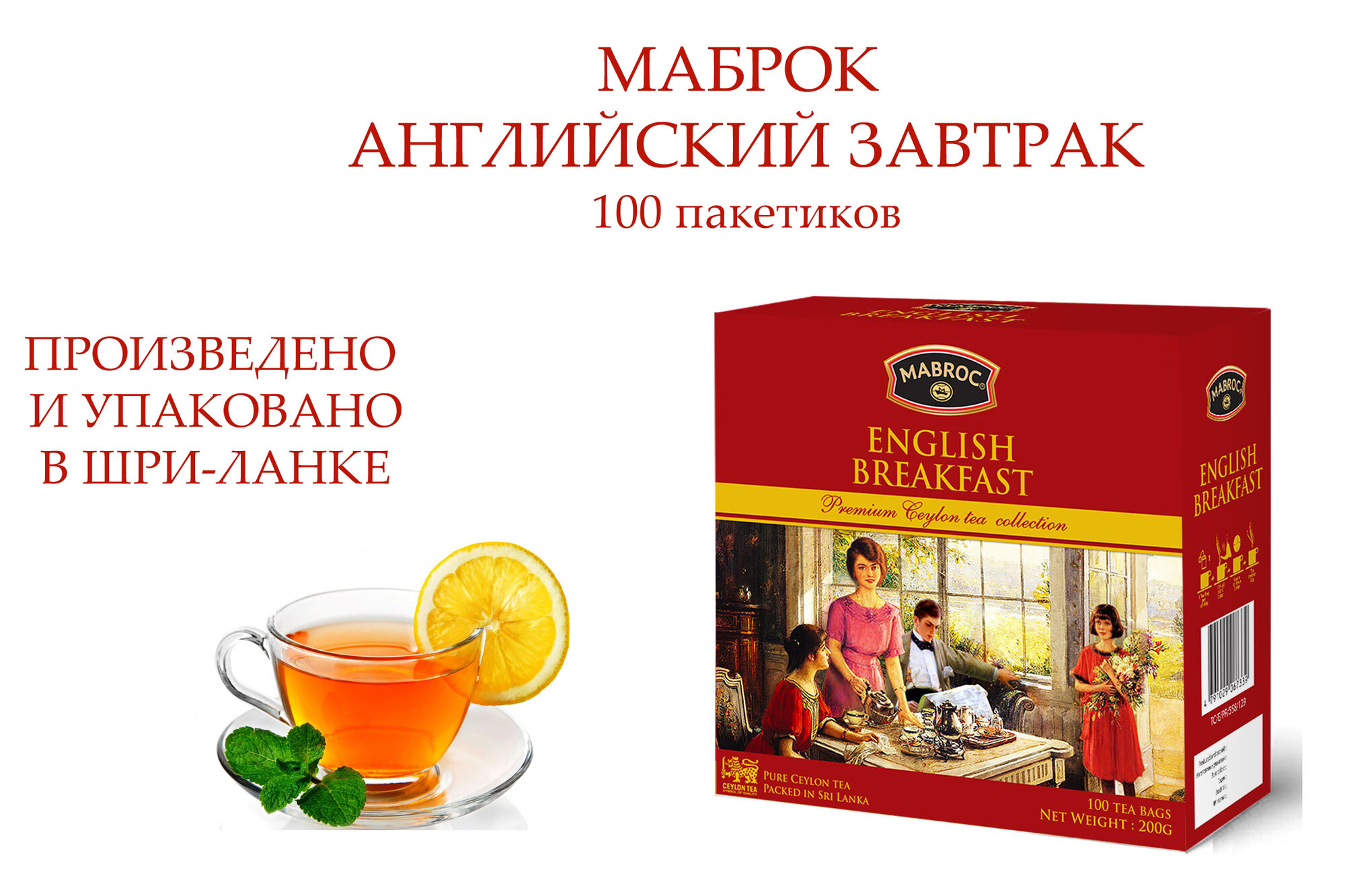 Чай Маброк Коллекция Английское чаепитие. Английский завтрак. Чай 100 пакетиков цейлонский Маброк. Производитель: Mabroc Teas, чай произведен и упакован в Шри-Ланке в фольгу для сохранения свежести и аромата. Состав: чай черный байховый мелколистовой 100%. На пачке с чаем нанесен логотип Лев с мечом с 17 пятнышками на шкуре - это гарантия Цейлонского Чайного Бюро на соответствие чая высокому стандарту качества цейлонского чая, упакованного только в пределах Шри-Ланки.
