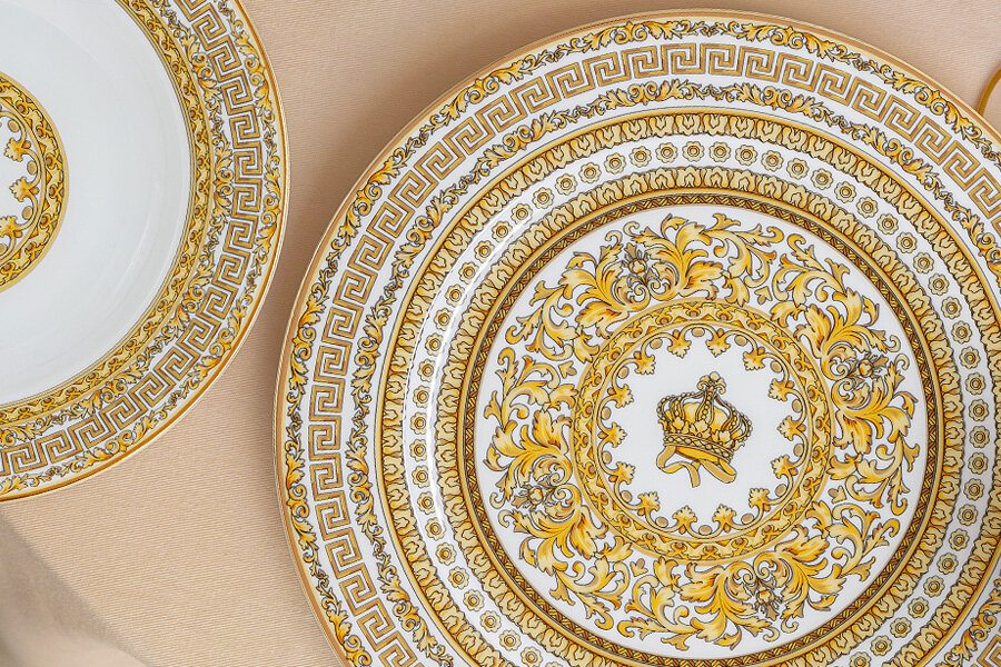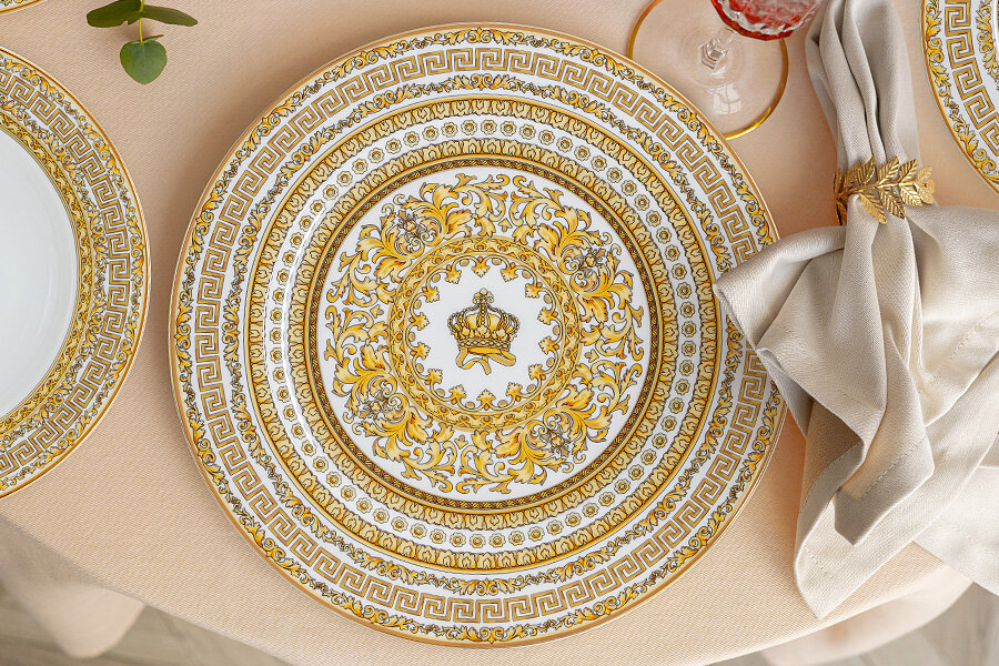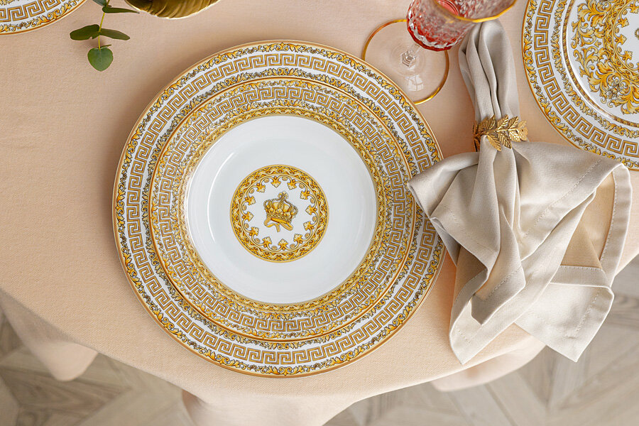 Коллекция "Тиара" — прекрасный выбор для торжественной и элегантной сервировки.Центральной композицией декора является корона, как символ Royal Crown, которая обрамлена различными орнаментами, включая знаменитый древний орнамент Меандр. Комбинация белоснежного костяного фарфора с золотом подчеркнёт атмосферу и важность любого события.Сервизы коллекции "Тиара" по-настоящему роскошны, они станут не только украшением Вашего стола и интерьера, но и прекрасным подарком для Ваших близких и друзей.Предметы коллекции нельзя использовать в микроволновой печи и посудомоечной машине. Рекомендуется мыть вручную тёплой водой с применением жидких моющих средств.