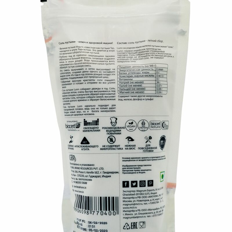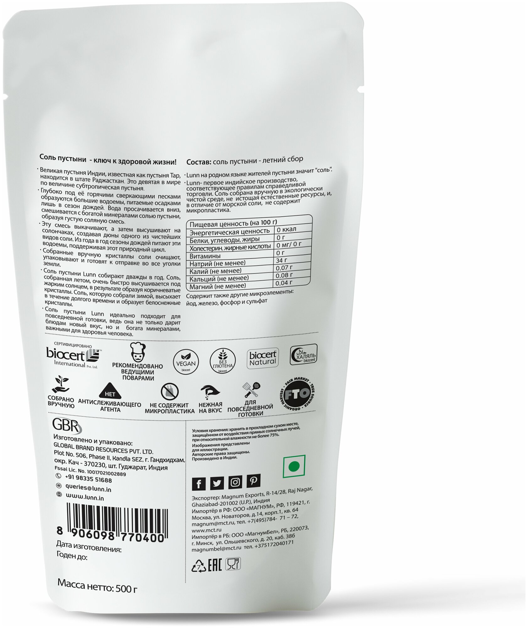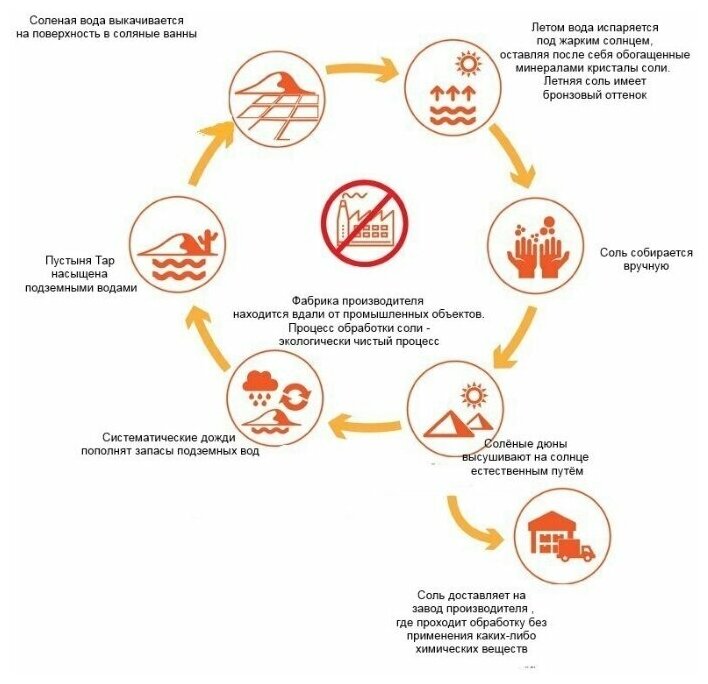 Великая пустыня Индии, известная как пустыня Тар, находится в штате Раджастхан. Это девятая в мире по величине субтропическая пустыня. Глубоко под её горячими сверкающими песками образуются большие водоемы, питаемые осадками лишь в сезон дождей. Вода просачивается вниз, смешивается с богатой минералами солью пустыни, образуя густую соляную смесь. Эту смесь выкачивают, а затем высушивают на солончаках, создавая дюны одного из чистейших видов соли. Из года в год сезоны дождей питают эти водоемы, поддерживая этот природный цикл. Собранные вручную кристаллы соли очищают, упаковывают и готовят к отправке во все уголки земли. Соль пустыни является сертифицированной экологически чистой продукцией. В отличие от морской соли, не содержит микропластик, антислеживающего агента, компонентов животного происхождения, глютен. Соль, собранная летом, очень быстро высушивается под жарким солнцем, в результате образуя коричневатые кристаллы.