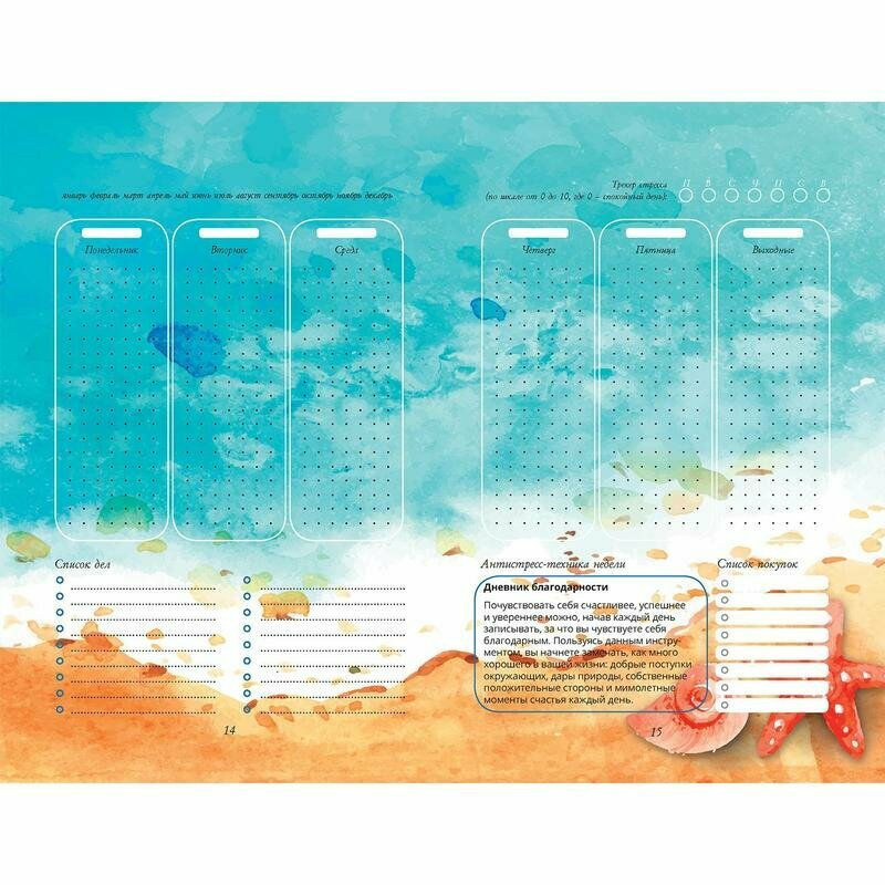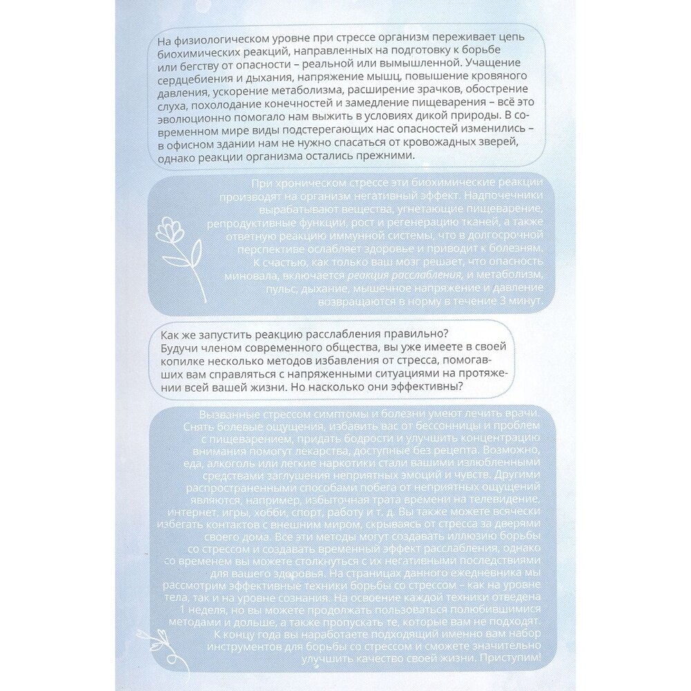 В современном мире большинство людей испытывает стресс регулярно, и причины тому могут быть самыми разными. Для борьбы с последствиями этого состояния человечество изобрело множество способов: психотерапию, лекарства, разнообразные вспомогательные практики, - но все они как правило требуют существенных временных и финансовых затрат. Однако, есть и простые, бюджетные способы преодолеть стресс самостоятельно; к одному из них относится последовательная работа над своим мышлением, состоящая из планирования, анализирования и несложных эффективных упражнений. Чтобы внедрить эту систему в наше напряженное повседневное расписание, был разработан предлагаемый еженедельник: он поможет вам планировать не только личные, семейные и рабочие вопросы, но и постепенно, день за днем, укреплять свою нервную систему и повышать осознанность, тем самым делая вас стрессоустойчивее, радостнее и мудрее. Каждый разворот еженедельника включает в себя удобную сетку со списками дел на каждый день и на всю неделю.