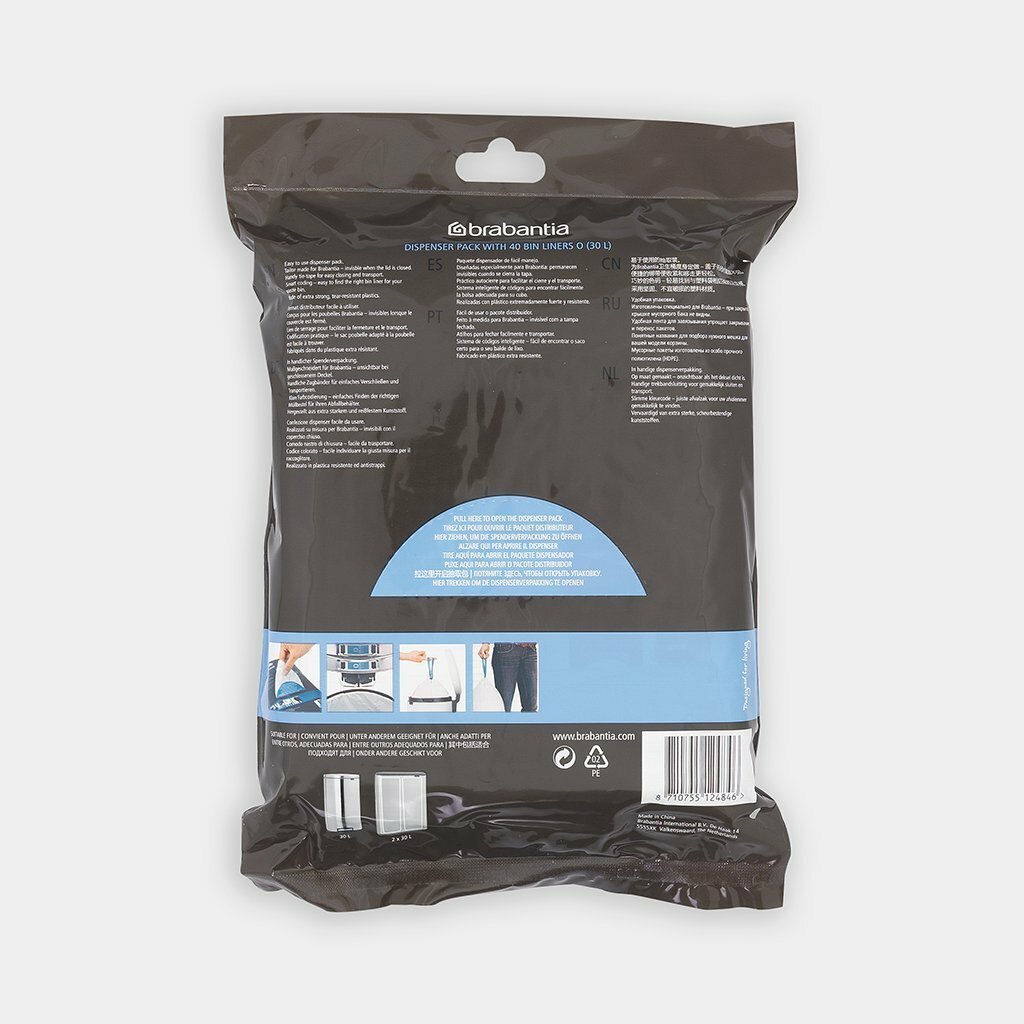 Удобно и быстро вкладываются и достаются из бака.Эстетичный вид – идеально подходят по размеру к мусорным бакам Brabantia, мешок не выступает наружу.Уникальная цветовая маркировка позволяет выбрать мешки нужного размера.Вентиляционные отверстия для удобства вкладывания в бак.Изготовлены из особо прочного полиэтилена (HDPE).Легко затягиваются и переносятся – специальная лента для стягивания горловины.Упаковка-диспенсер: 40 мешков.