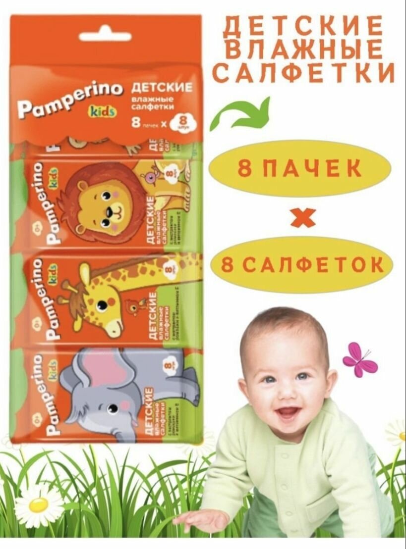 Салфетки влажные Pamperino kids с экстрактом ромашки и витамином Е набор 8 упаковок по 8 штук