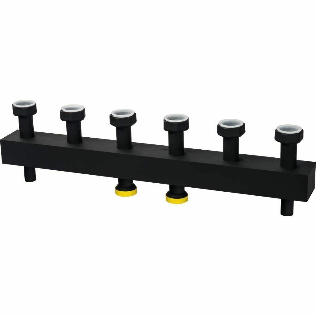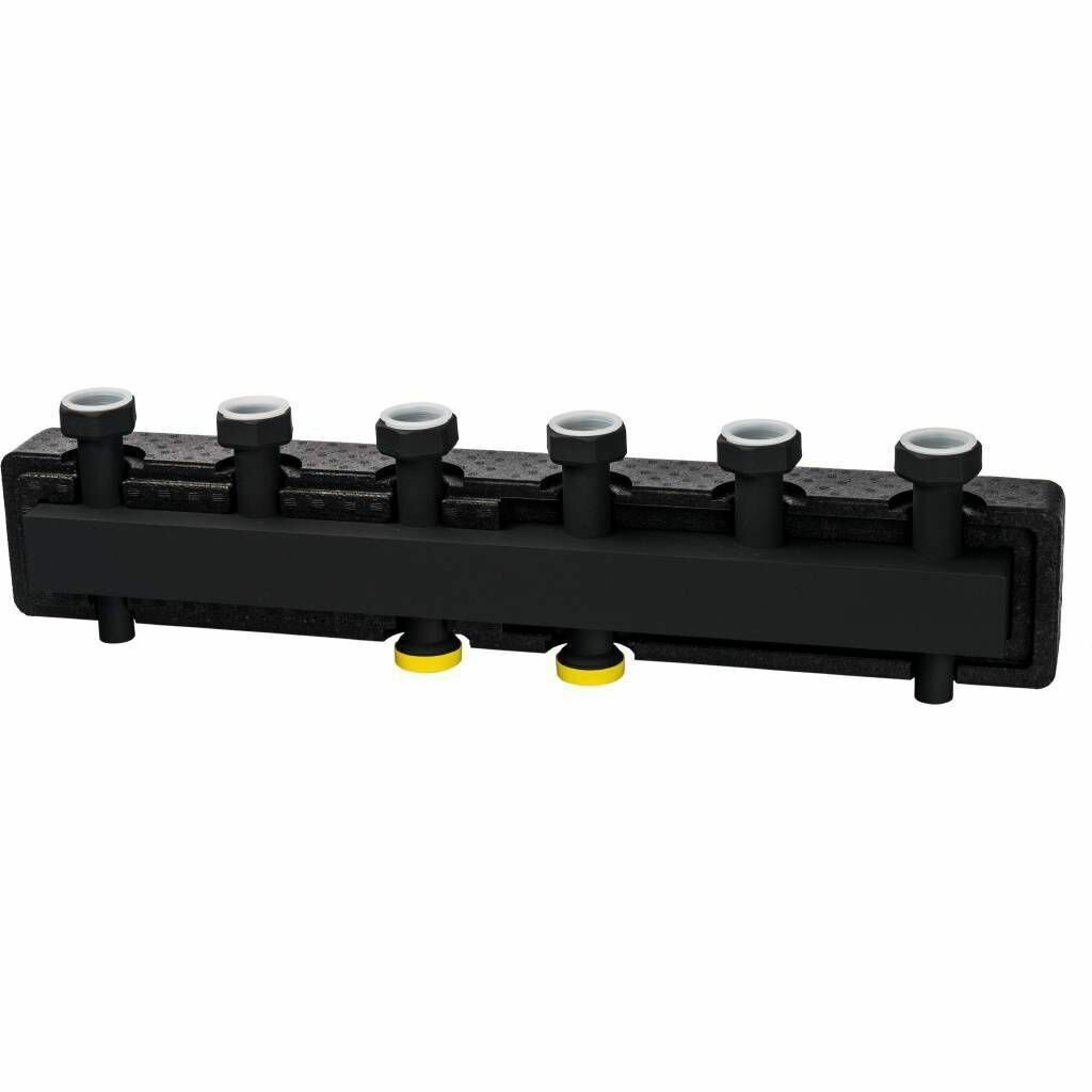 Стальной распределительный коллектор 3 отопительных контура. В теплоизоляции DN 25 STOUT (СТАУТ) SDG-0016-004003 имеет 6 выходных патрубков для организации распределения потоков теплоносителя между контурами отопления. Устройство характеризуется высокой надёжностью и неприхотливостью, на всем сроке службы не требует постоянного обслуживания.