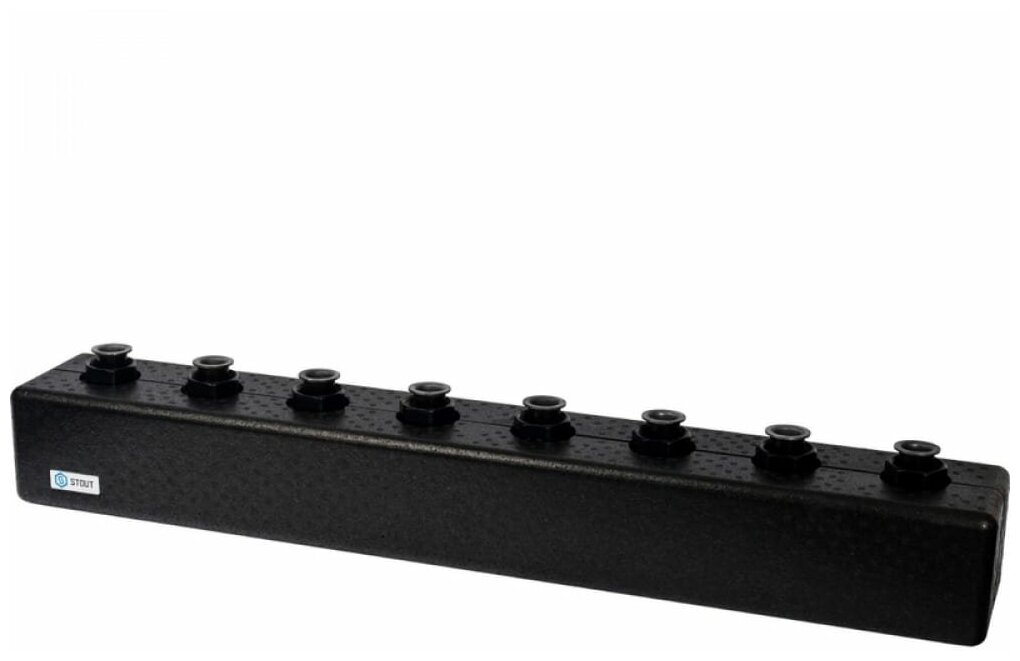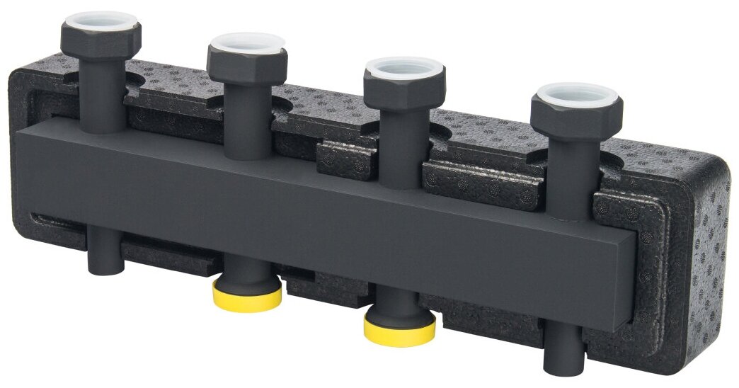 Stout SDG-0016-004004 - стальной распределительный коллектор в теплоизоляции, который предназначен для монтажа насосных групп и рассчитан на 4 отопительных контура. С помощью данного коллектора происходит эффективное теплораспределение на все необходимые отопительные контуры: горячее водоснабжение, теплый пол и т.п.