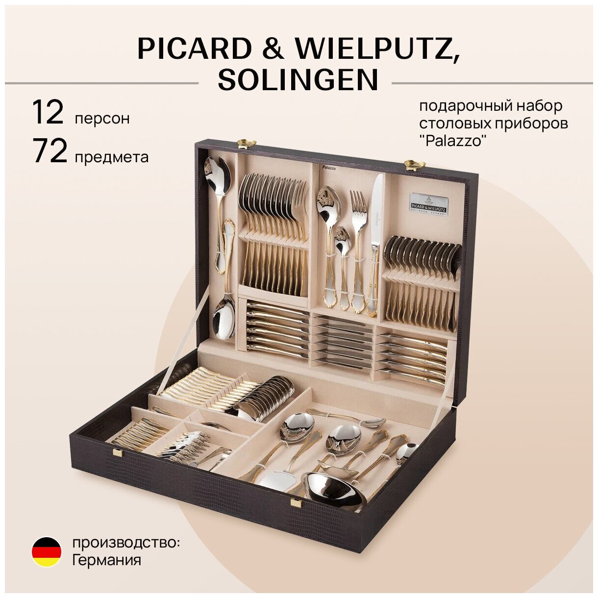 Фабрика-производитель столовых приборов PICARD & WIELPÜTZ основана в 1927 году в городе Золинген, Германия. Столовые приборы сделаны из коррозионностойкой хромоникелевой стали 18/10 (18 % хрома, 10 % никеля). Рисунок черенка декорирован золотом 24 К, толщина покрытия 1 микрон. На каждом изделии стоит клеймо «SOLINGEN GERMANY». Красивые и удобные столовые приборы SOLINGEN позволяют вам не только украсить стол, но и создают особую атмосферу праздника. Особый шик столовым приборам придает матированная поверхность черенков. Оптимальная форма столовых приборов SOLINGEN шлифовалась десятилетиями. Многообразие декоров, удобство пользования и износостойкость - результат многолетнего наследия немецких мастеров в изготовлении изделий для сервировки стола. Столовые приборы фабрики-производителя PICARD & WIELPÜTZ отвечают самым высоким современным требованиям, являются изделиями высшей категории качества и имеют практически неограниченный срок эксплуатации. Набор столовых приборов упакован в подарочный футляр, который изготовлен из дерева и отделан искусственными кожей игуаны снаружи и замшей внутри. Для мытья столовых приборов применяйте жидкие моющие средства, не содержащие абразивы. Рекомендуется мыть в посудомоечной машине.