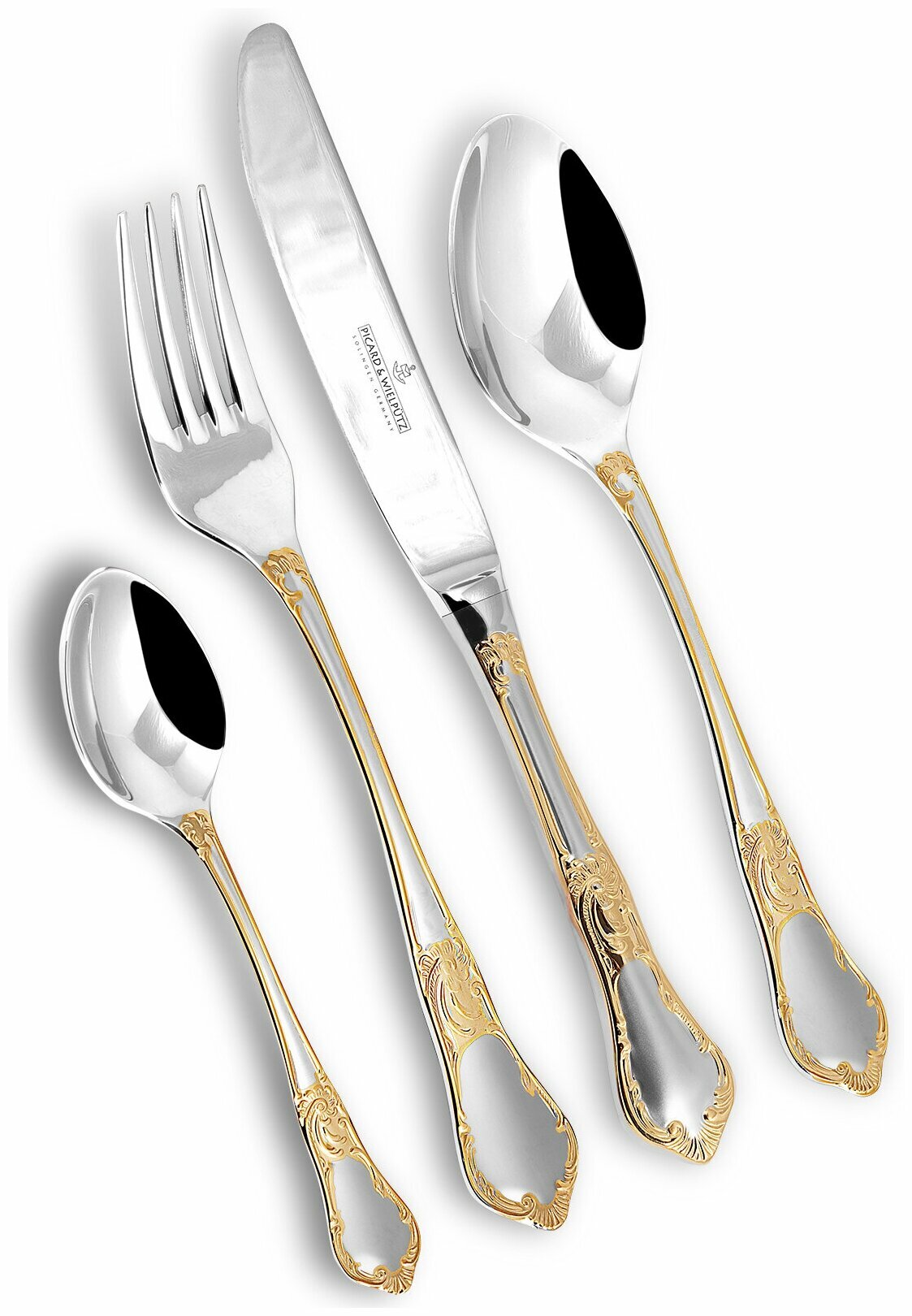 Набор столовых приборов 72 предмета на 12 персон модель «Ampir» с позолотой.Фабрика PICARD & WIELPÜTZ была основана в городе Золинген (Германия) в 1927 году и имеет долгую и славную историю. Фабрика специализируется по производстве столовых приборов. С момента основания фирмы она работает под девизом: «wie man es besser machen konnte» - «как сделать это лучше». Столовые приборы PICARD & WIELPÜTZ на сегодняшний день отвечают самым высоким современным требованиям, являются изделиями высшей категории качества и имеют практически неограниченный срок эксплуатации. Вся продукция производится в Германии на собственном производстве и на каждое изделие ставится фирменное клеймо.Столовые приборы изготавливаются из коррозионностойкой хромоникелевой стали марки 18/10 (18% хрома, 10% никеля). Детали рисунков на черенках покрыты золотом высокой пробы в 24 карата. За почти 100-летнюю историю фирме PICARD & WIELPÜTZ удалось разработать оптимальную форму столовых приборов.Всем известно – для того чтобы сделать самое изысканное блюдо настоящим «праздником для глаз» необходимо окружить его изысканными столовыми приборами и предметами сервировки. Столовые наборы PICARD & WIELPÜTZ отлично справляются с этой задачей и позволяют не только украсить стол, но и создать атмосферу праздника. Наборы послужат отличным подарком на любое праздничное событие. Набор упакован в подарочный чемодан, изготовленный из дерева и отделанный снаружи искусственной кожей игуаны и замшей внутри.Наборы столовых приборов от PICARD & WIELPÜTZ поставляются в различных вариантах комплектации: 72 предмета – 12 персон, 24 предмета – 6 персон, 16 предметов – 6 персон.