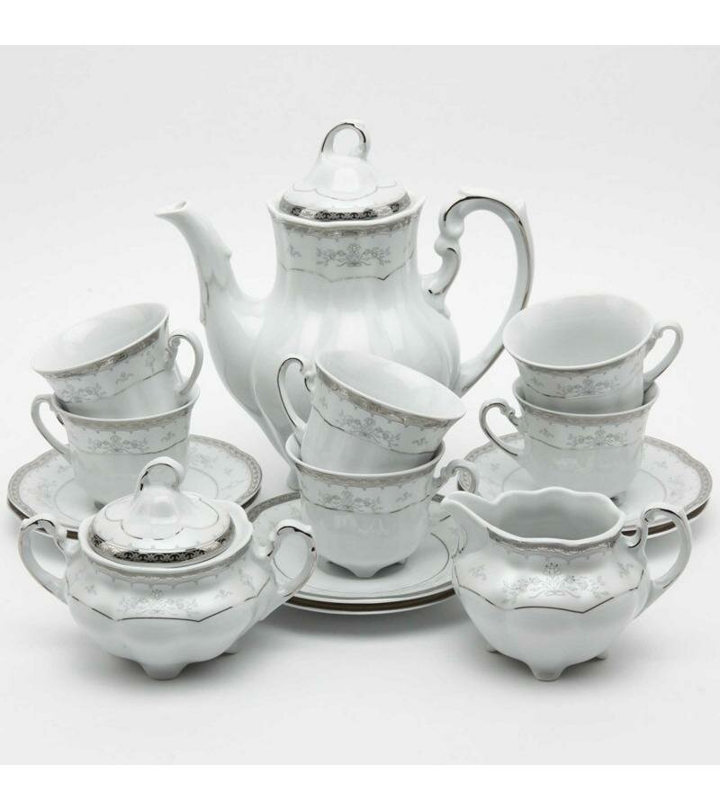 Кофейный сервиз на 6 персон 15 предметов Cmielow "Болеро /Платиновый узор" (230 мл)0 - прекрасный выбор для любителей кофе. Посуда предназначена на компанию из 6 человек. Основной цвет белый, форма болеро, декор платиновый узор. Набор состоит из 15 предметов.Товар выполнен из фарфора, произведен польской компанией Cmielow.