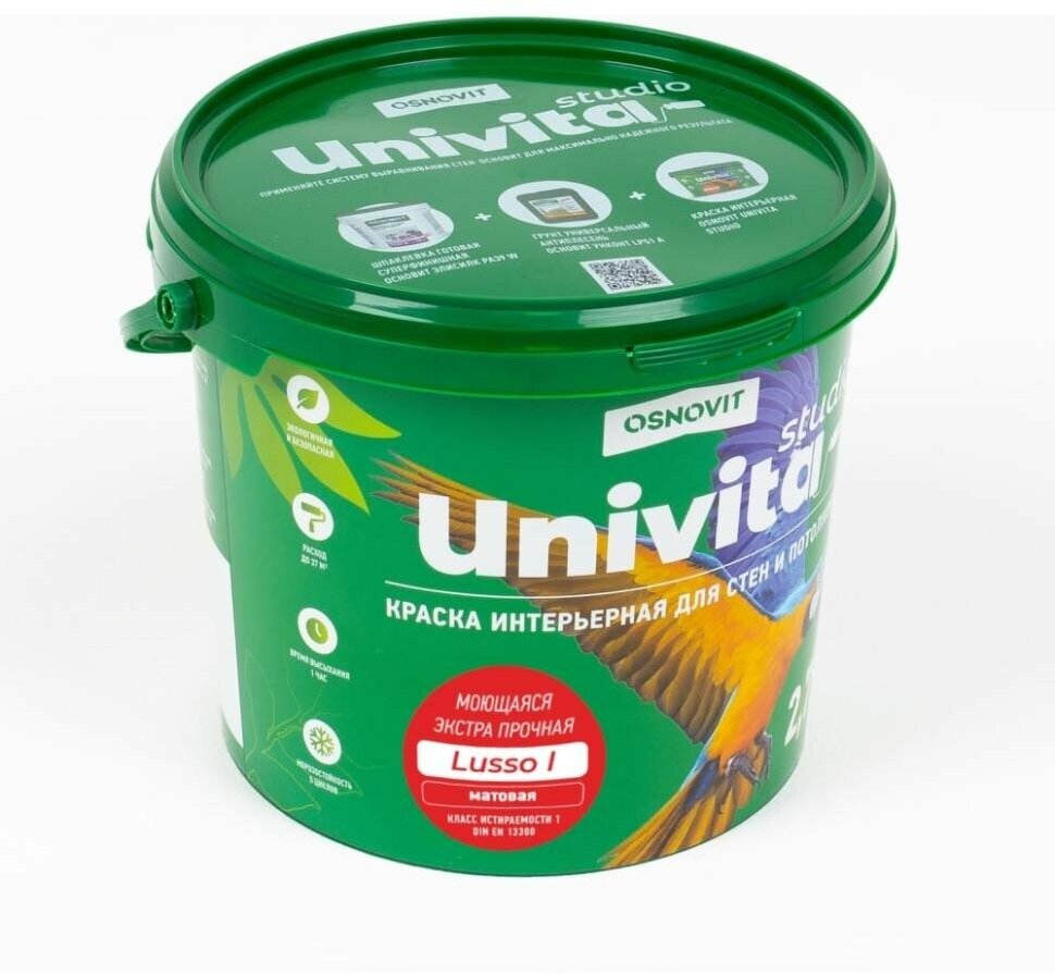Краска Основит Унивита Studio Lusso1 водно-дисперсионная интерьерная моющаяся экстрапрочная матовая для стен и потолков с нейтральным запахом. Предназначена для окрашивания стен и потолков в помещениях с нормальной и повышенной влажностью. Скрывает мелкие дефекты поверхности. Краска образует влагостойкое, устойчивое к многократному интенсивному мытью с применением бытовых абразивных моющих средств покрытие (1 класс износостойкости к истиранию по стандарту ISO 11998/DIN EN 13300). Легко наносится без разбрызгивания и подтеков. Для внутренних работ. Рекомендуется для детских и лечебно-профилактических учреждениях. Имеет высокую степень белизны. Для ручного и механизированного нанесения. Гипоаллергенная.