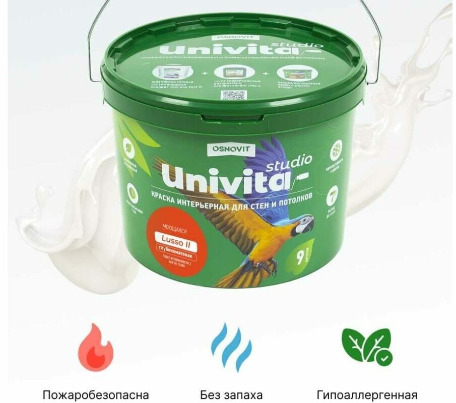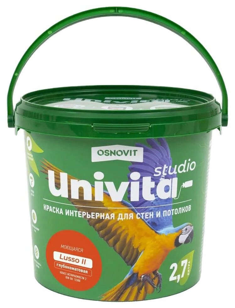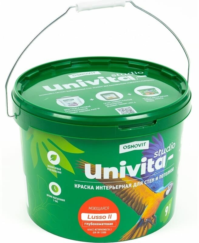 Краска Основит Унивита Studio Lusso 2 водно-дисперсионная интерьерная моющаяся глубокоматовая для стен и потолков с нейтральным запахом. Предназначена для окрашивания стен и потолков в помещениях с нормальной и повышенной влажностью. Скрывает мелкие дефекты поверхности. Краска образует влагостойкое, устойчивое к многократному интенсивному мытью с применением бытовых абразивных моющих средств покрытие (2 класс износостойкости к истиранию по стандарту ISO 11998/DIN EN 13300). Легко наносится без разбрызгивания и подтеков. Для внутренних работ. Рекомендуется для детских и лечебно-профилактических учреждениях. Имеет высокую степень белизны. Для ручного и механизированного нанесения.