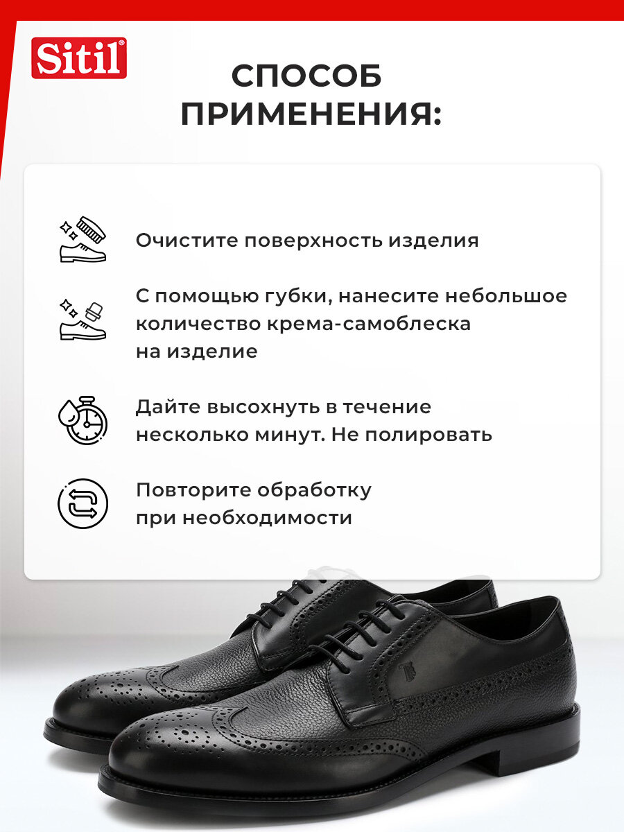 | Способ применения | С помощью губки-аппликатора нанести средство на предварительно очищенную сухую поверхность обуви. Время полного высыхания 1-3 минуты. Одной баночки хватает на 50-60 пар. |