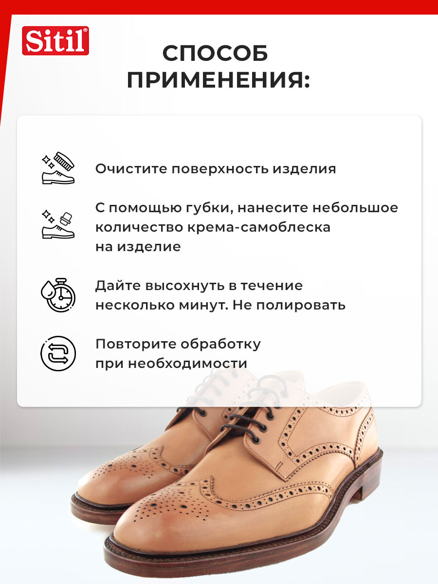| Способ применения | С помощью губки-аппликатора нанести средство на предварительно очищенную сухую поверхность обуви. Время полного высыхания 1-3 минуты. Одной баночки хватает на 50-60 пар. |