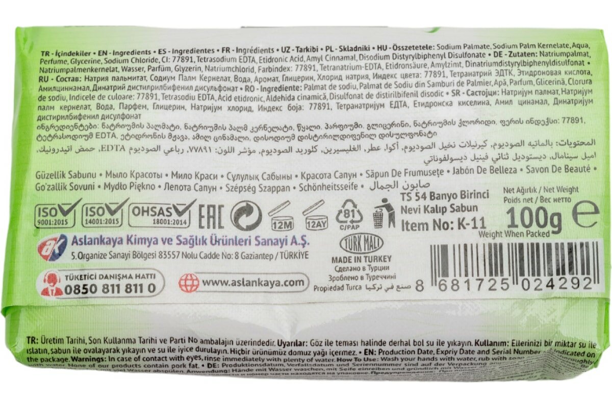 | Химический состав | Натрия пальмитат, Содиум Палм Кернелат, Вода, Аромат, Глицерин, Хлорид натрия, Индекс цвета: 77891, Тетранатрий ЭДТК, Этидроновая кислота, Кумарин, Динатрий дистилрилбифенил дисульфонат |