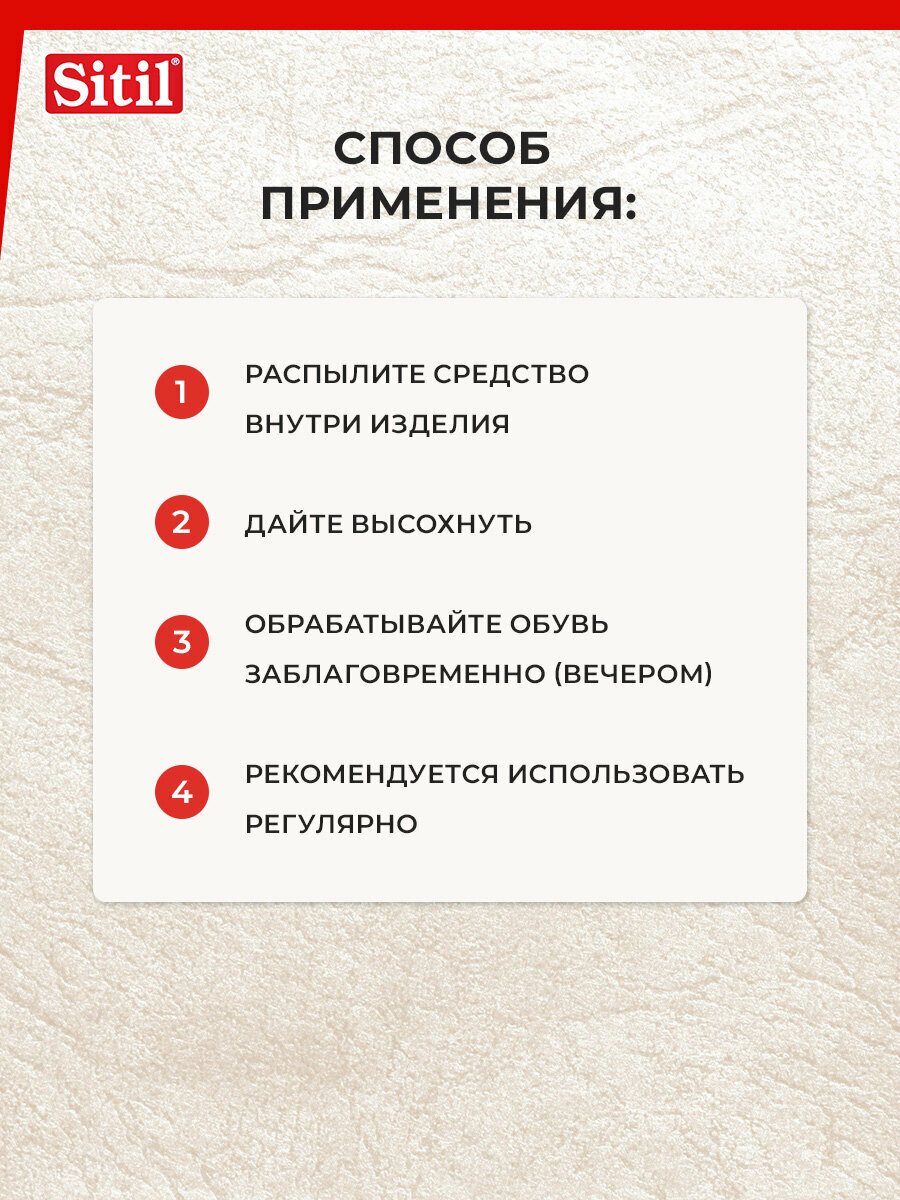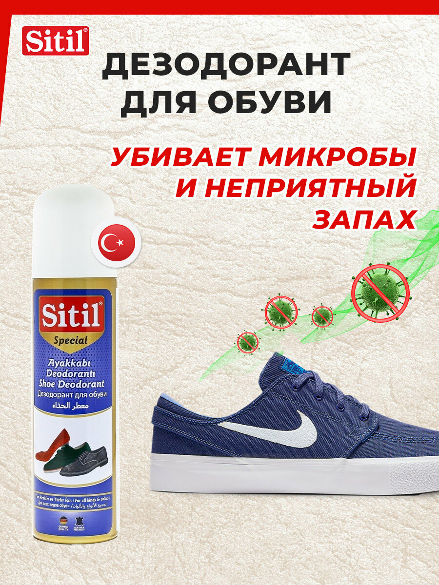 ДезоДезодорант для обуви с антибактериальным эффектом Sitil устраняет неприятные запахи в обуви и придает изысканный и нежный аромат любимой обуви. Дезодорант нейтрализует неприятные запахи в повседневной и спортивной обуви. Подходит для обработки: - Для спортивной обуви - Для кроссовок - Для коньков и роликов - Для горнолыжных ботинок - Для борцовок - Для повседневной обуви