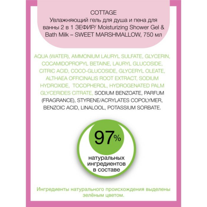 Гель для душа и пена для ванн Cottage Moisturizing Shower Gel & Bath Milk Sweet Marshmallow бережно очищает кожу от загрязнений. Освежает и тонизирует, помогает расслабиться. Активные компоненты в составе — интенсивно питают и увлажняют, придают мягкость и эластичность. Оставляет сладкий аромат ванили. Образует густую нежную пену, полностью смывается. Сохраняет естественный pH-баланс.Способ применения: нанести на влажную кожу, вспенить и смыть.