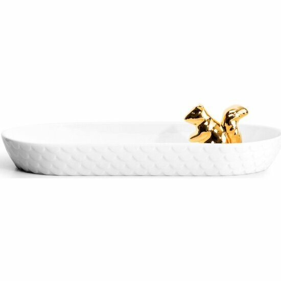Белое керамическое блюдо из коллекции Winter с фактурной поверхностью в виде полукруглых чешуек охраняет его хозяйка – золотая белочка. В таком блюде любые фрукты или закуски будут смотреться празднично, но самыми уместными в нем будут, конечно же, орехи или конфеты. Посуда и аксессуары из коллекции Winter создана для того, чтобы отражать и множить мерцание елочных гирлянд и свечей, отгоняющих зимнюю темноту, для рождественских сладостей и горячего глинтвейна, для праздничного застолья, за которым собирается вся семья.Размер: 26x12x6 см.