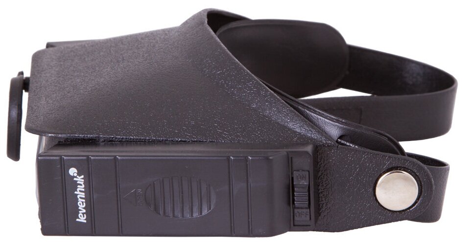 Лупа Levenhuk имеет гибкий фиксатор. Его можно регулировать по длине, что позволяет надежно закрепить лупу на голове. По обеим сторонам от основной линзы расположены две лампочки подсветки, работающие от батареек (батарейки в комплект не входят).
