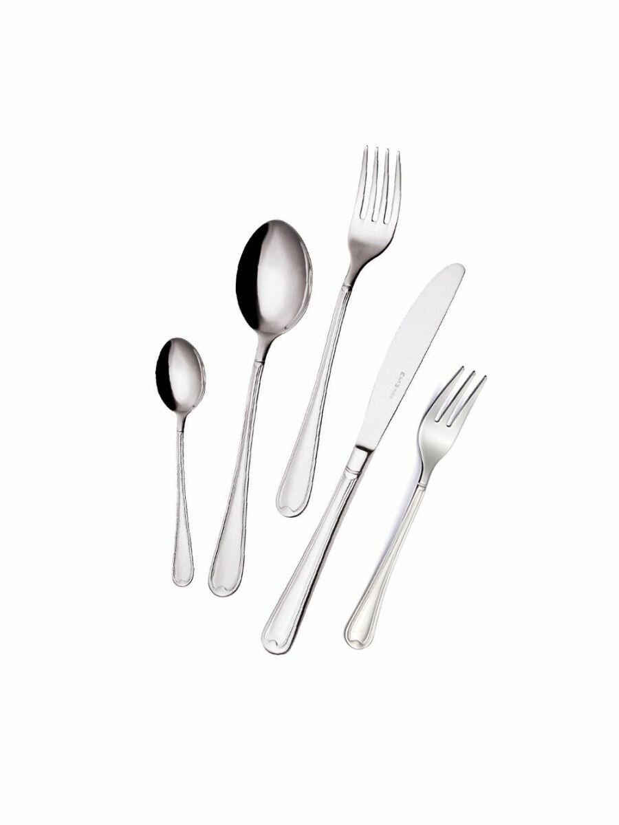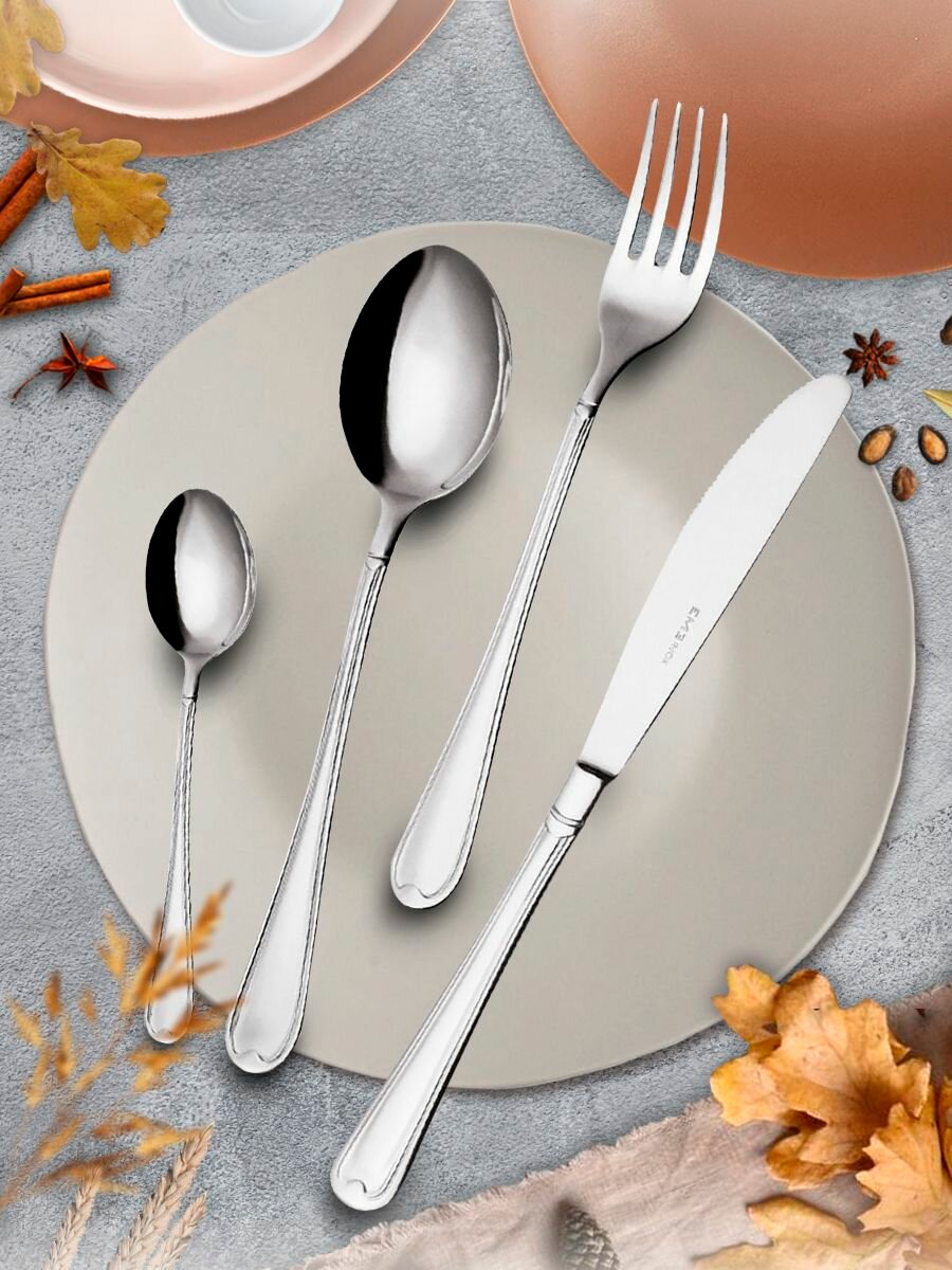 Размеры приборов:нож столовый 21,8 см; длина лезвия 10 смвилка столовая 19,7 смложка столовая 19,7 смложка чайная 13 смвилка десертная 15,2 смНабор EME Euro включает в себя: 6 столовых ложек, 6 вилок, 6 столовых ножей, 6 чайных ложек и 6 десертных вилок. Все приборы изготовлены из нержавеющей стали 18/10 с глянцевой поверхностью.Зеркальная полировка столовых приборов коллекции Euro достигается при помощи обработки поверхности специальными валиками и мелкозернистыми абразивными пастами, придающими блеск.Euro — это коллекция столовых приборов с романтичным и изысканным декором, идеально подходящая для сервировки стола в классическом стиле. Также Вы можете дополнить набор необходимыми приборами из коллекции Euro.