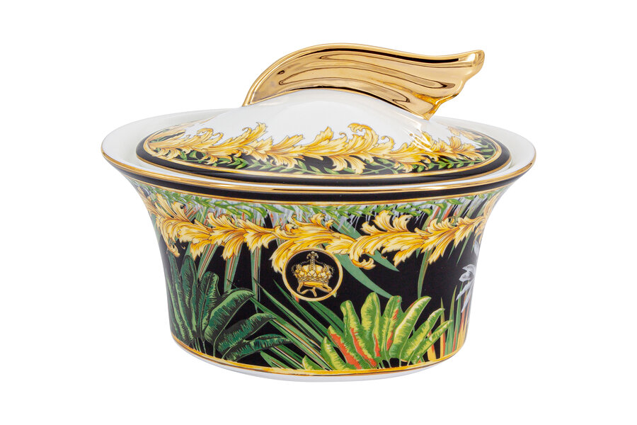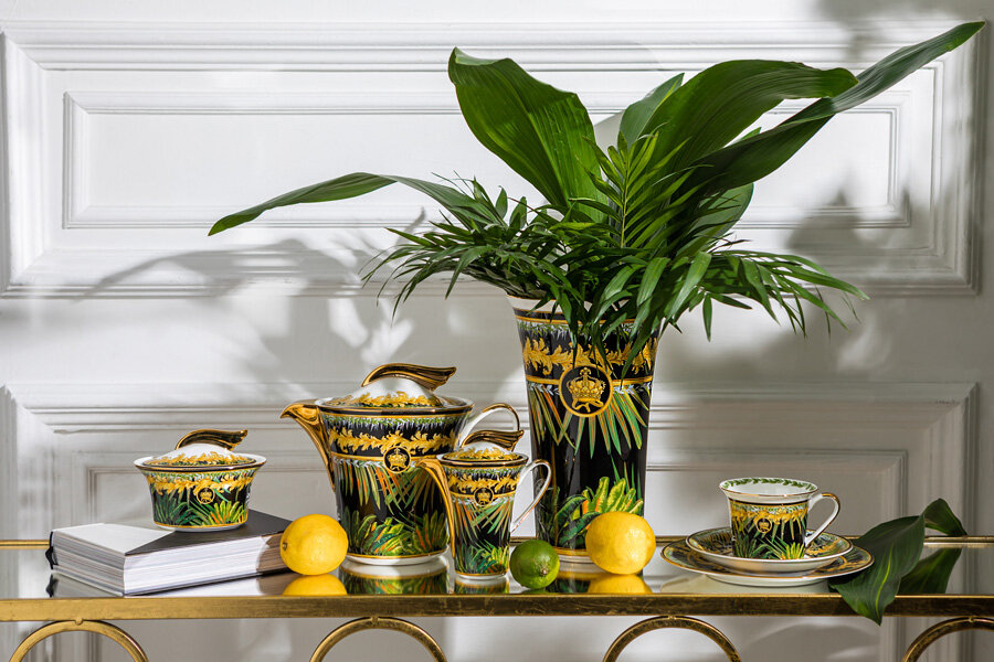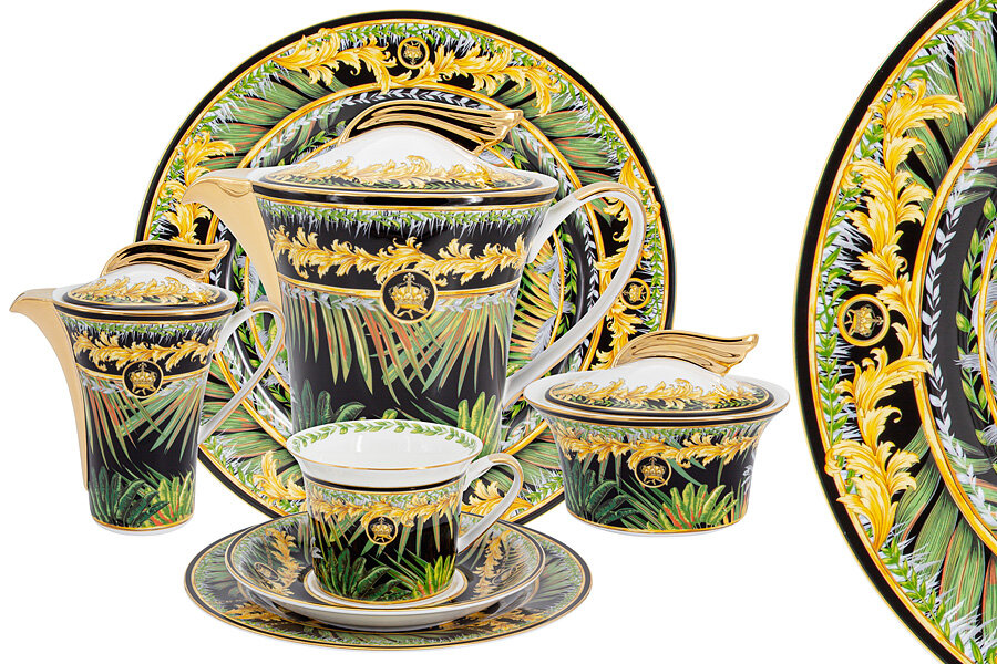 Великолепный костяной фарфор замысловато украшен листвой, благодаря проработанным деталям, декор выглядит очень живописно. Яркие переливающиеся цвета, тонкие линии причудливых рисунков отправляют нас в волшебное путешествие, продолжая тему райского сада. Эта коллекция воплощает в себе поразительную энергию природы,
