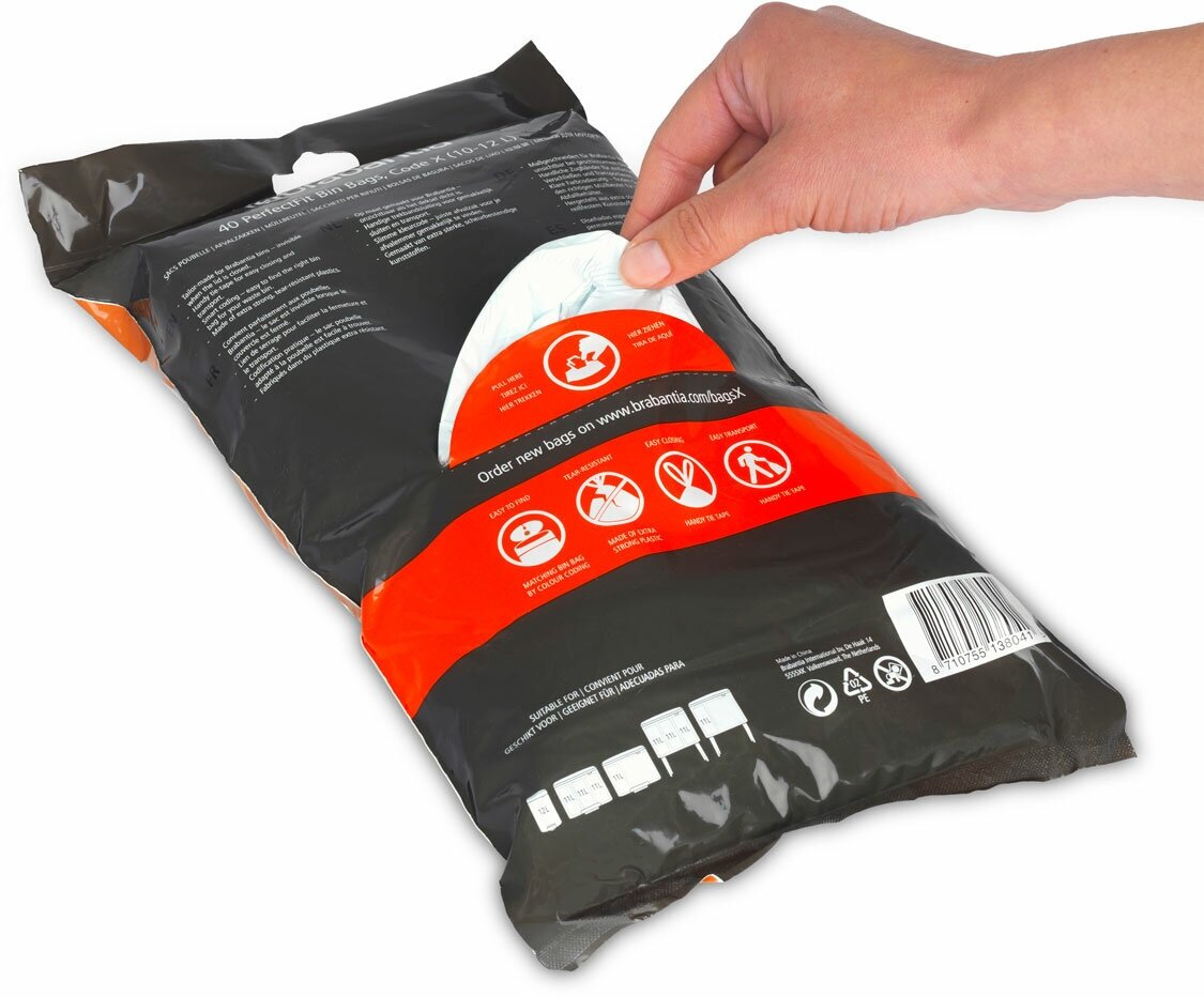 Удобно и быстро вкладываются и достаются из бака.Эстетичный вид – идеально подходят по размеру к мусорным бакам Brabantia, мешок не выступает наружу.Уникальная цветовая маркировка позволяет выбрать мешки нужного размера.Вентиляционные отверстия для удобства вкладывания в бак.Изготовлены из особо прочного полиэтилена (HDPE).Легко затягиваются и переносятся – специальная лента для стягивания горловины.Упаковка-диспенсер: 40 мешков.