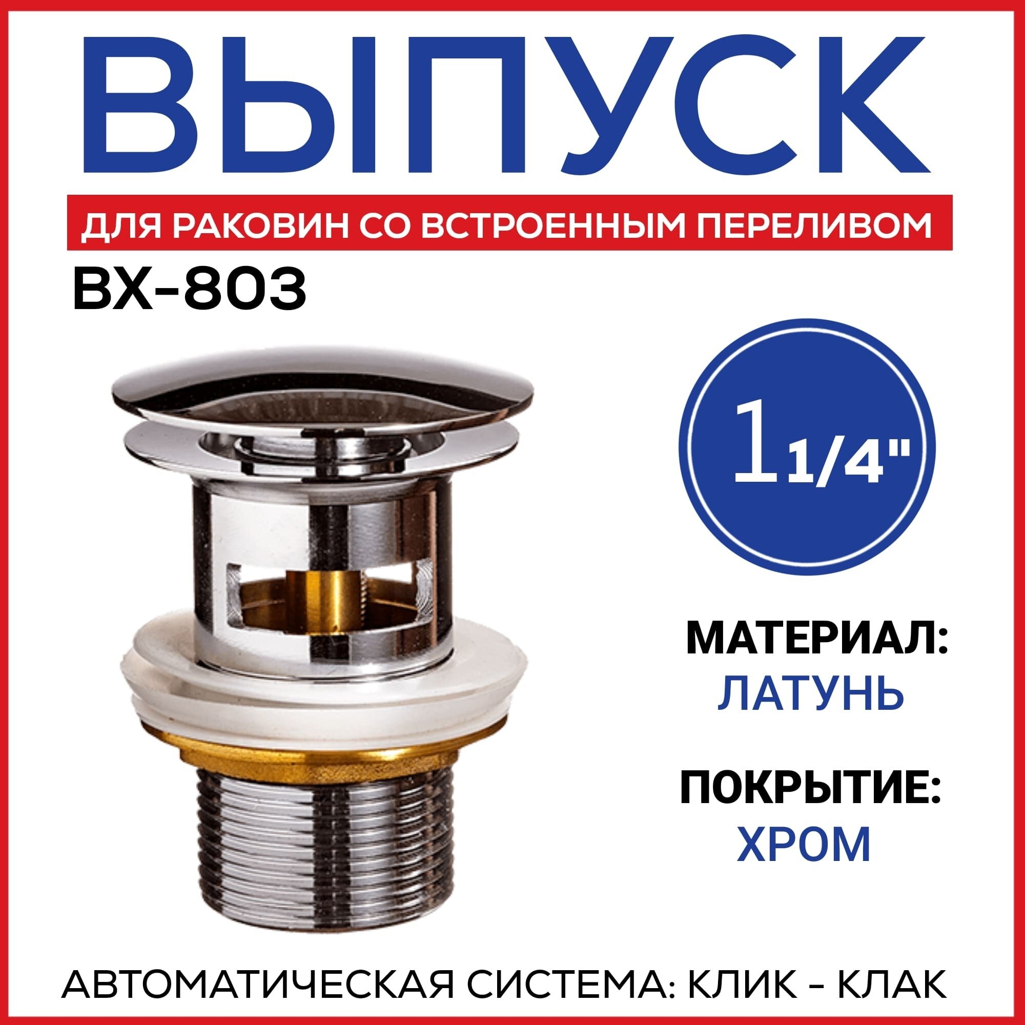 Латунный выпуск, покрытый хромом с системой "клик клак" для умывальников со встроенным переливом. Необходим сифон с патрубком с резьбой 1 1/4.