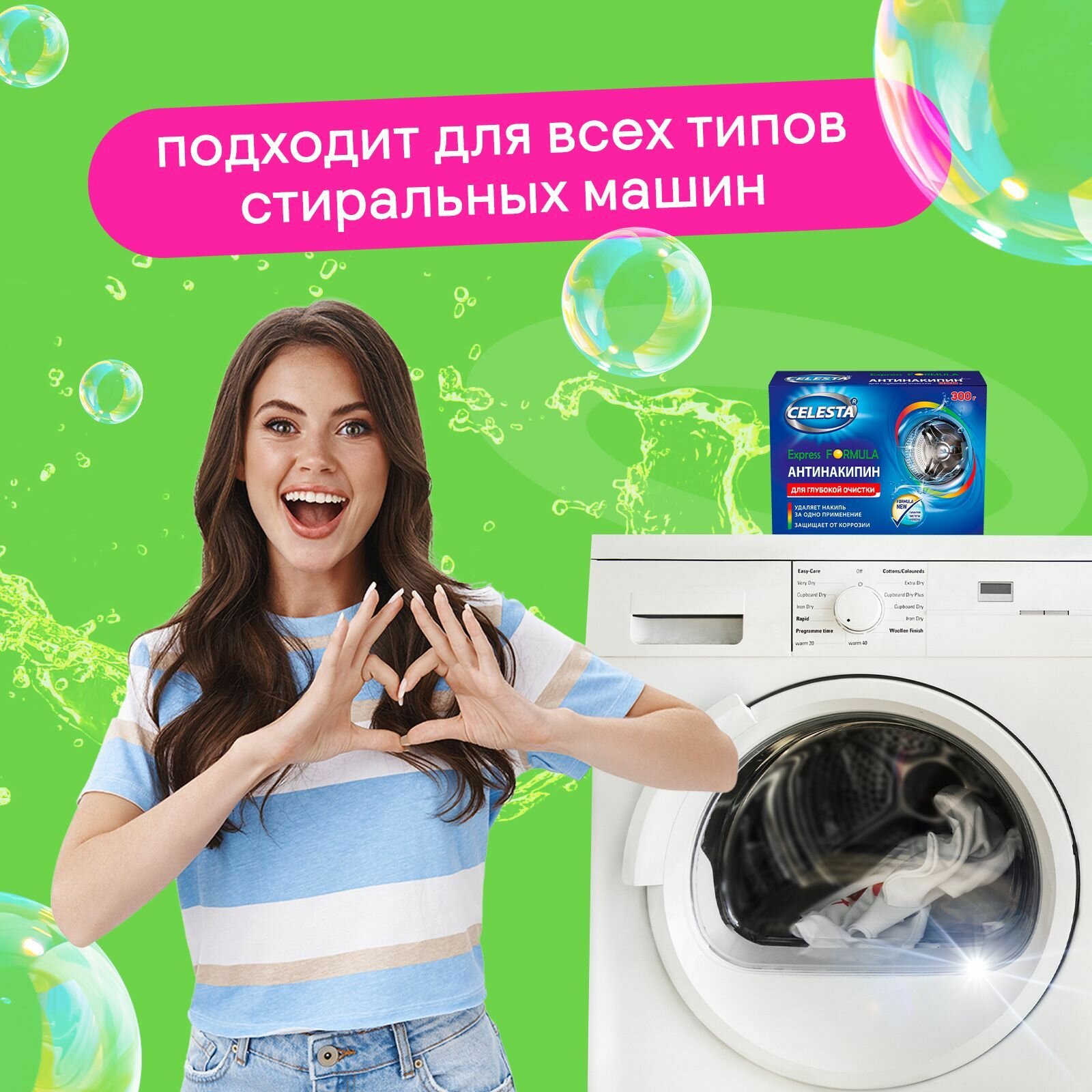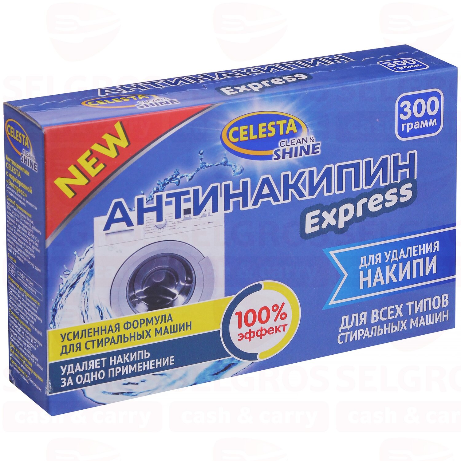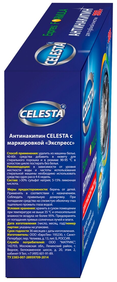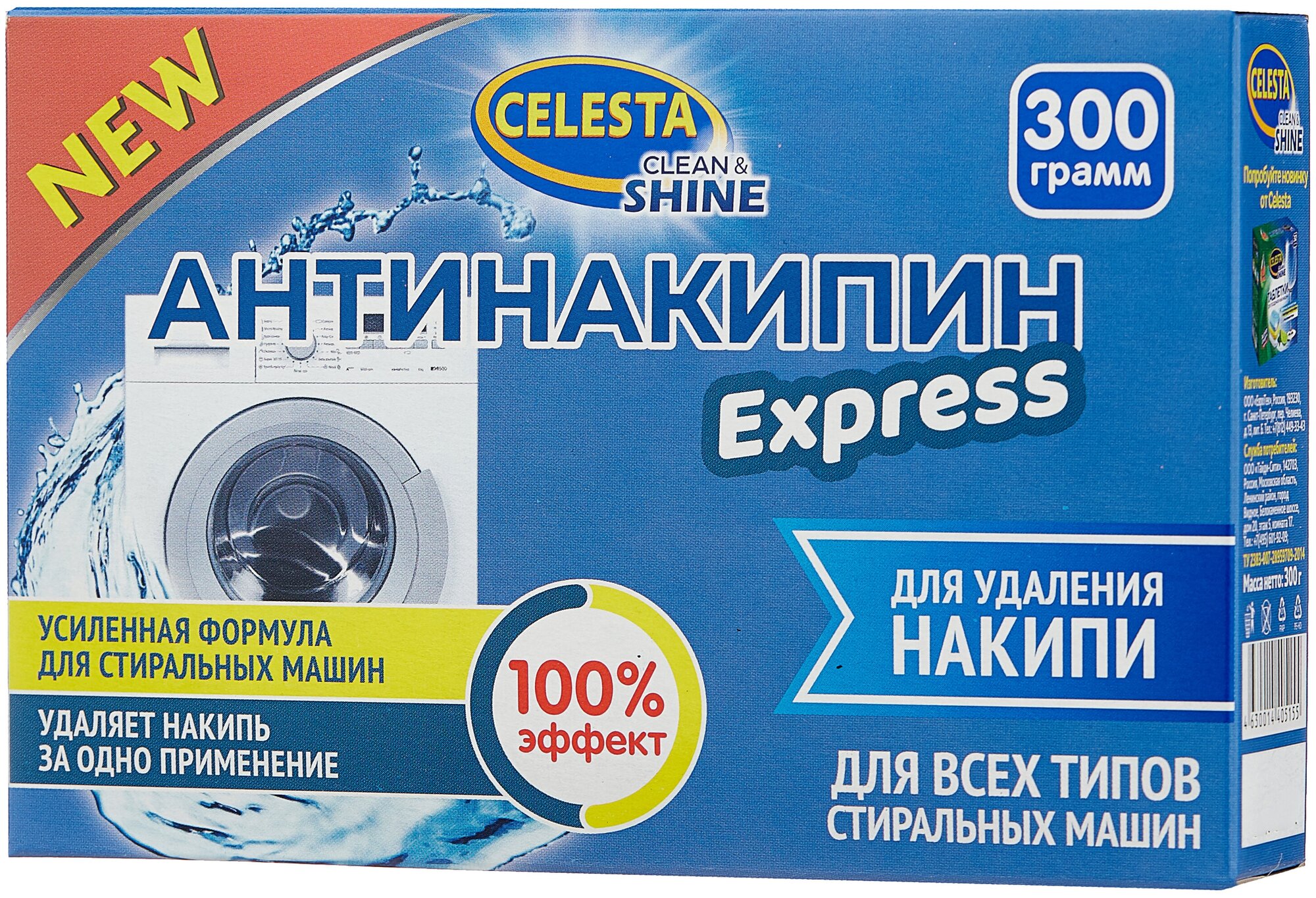 Антинакипин Celesta Express Для всех типов стиральных машин 300 г благодаря новой усиленной формуле полностью удаляет накипь за одно применение! На одно применение достаточно всего 100 гр средства. Можно использовать во всех типах стиральных машин.