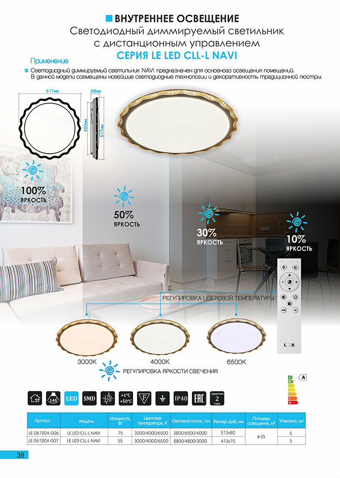 Дополнительные характеристики: Возможность изменения освещения: теплый свет (3000К), дневной свет (4500К), холодный свет (6500К), плавная регулировка яркости и цветовой температуры. Функция ночного освещения со сниженным потреблением электроэнергии. Функция отложенного выключения (30 мин). Функция памяти, позволяющая запоминать предпочтительный режим освещения. Возможность управления двумя светильниками с помощью одного пульта. Управление функциями светильника производится с помощью пульта дистанционного управления, входящего в комплект поставки, либо с помощью выключателя. Световой поток - 3800/6500/4000 Лм. Импульсный блок питания.