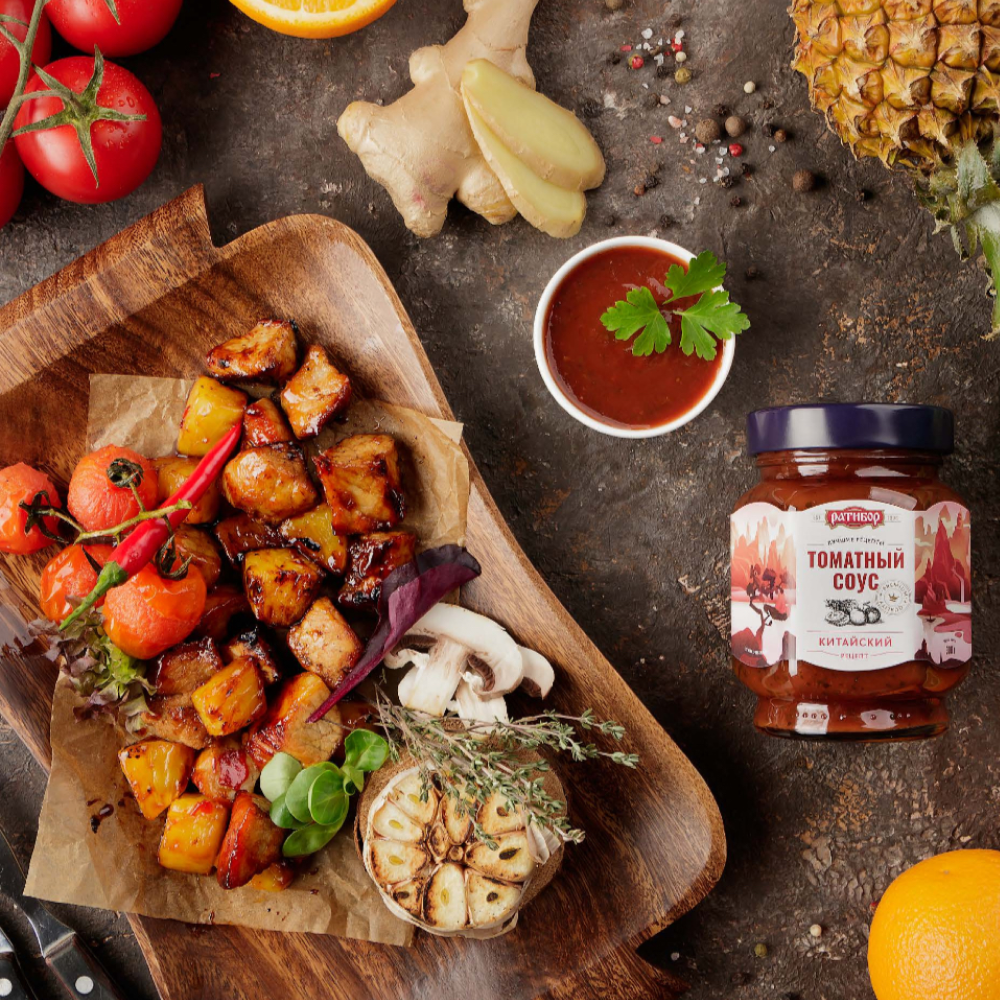 | Состав | Томатная паста, ананас свежий, сок апельсина, сахар, яблочное пюре, соевый соус, соль пищевая, чеснок свежий, регулятор кислотности – уксусная кислота, пряности: имбирь молотый, зелень сушеная (базилик, кинза). |