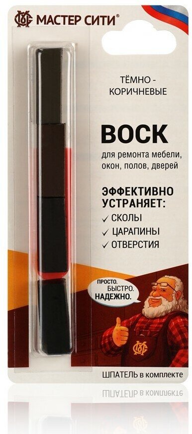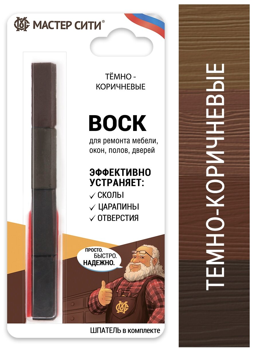 Набор мягких восков Мастер Сити (4 цвета; темно-коричневые; блистер) 2012301 предназначен для быстрой реставрации повреждений (сколы, вмятины, трещины, царапины) на деревянных поверхностях, не подверженных интенсивной эксплуатации. Способ применения: Очистить ремонтируемую поверхность. Срезать ножом все выступающие и отслоившиеся частички материала. На пластике подрезать края царапины вертикально. Нанести воск можно двумя способами: 1. Затереть воск; 2. Вдавить шпателем в повреждение, одновременно разглаживая на поверхности. Излишки воска убрать шпателем.