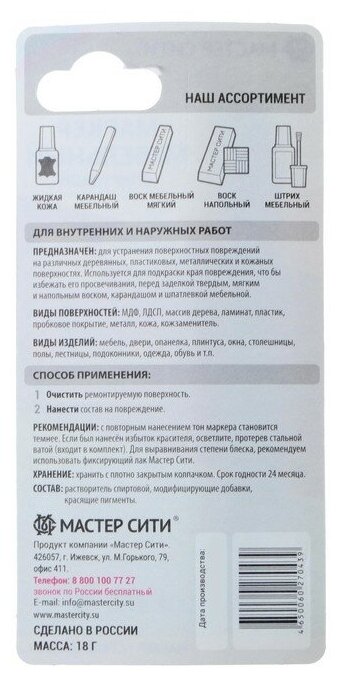 На сегодняшний день товар «Мастер Сити Маркер мебельный спиртовой (блистер) Орех темный 418 2051418» можно купить с кешбеком в 1 магазине: Яндекс.Маркет